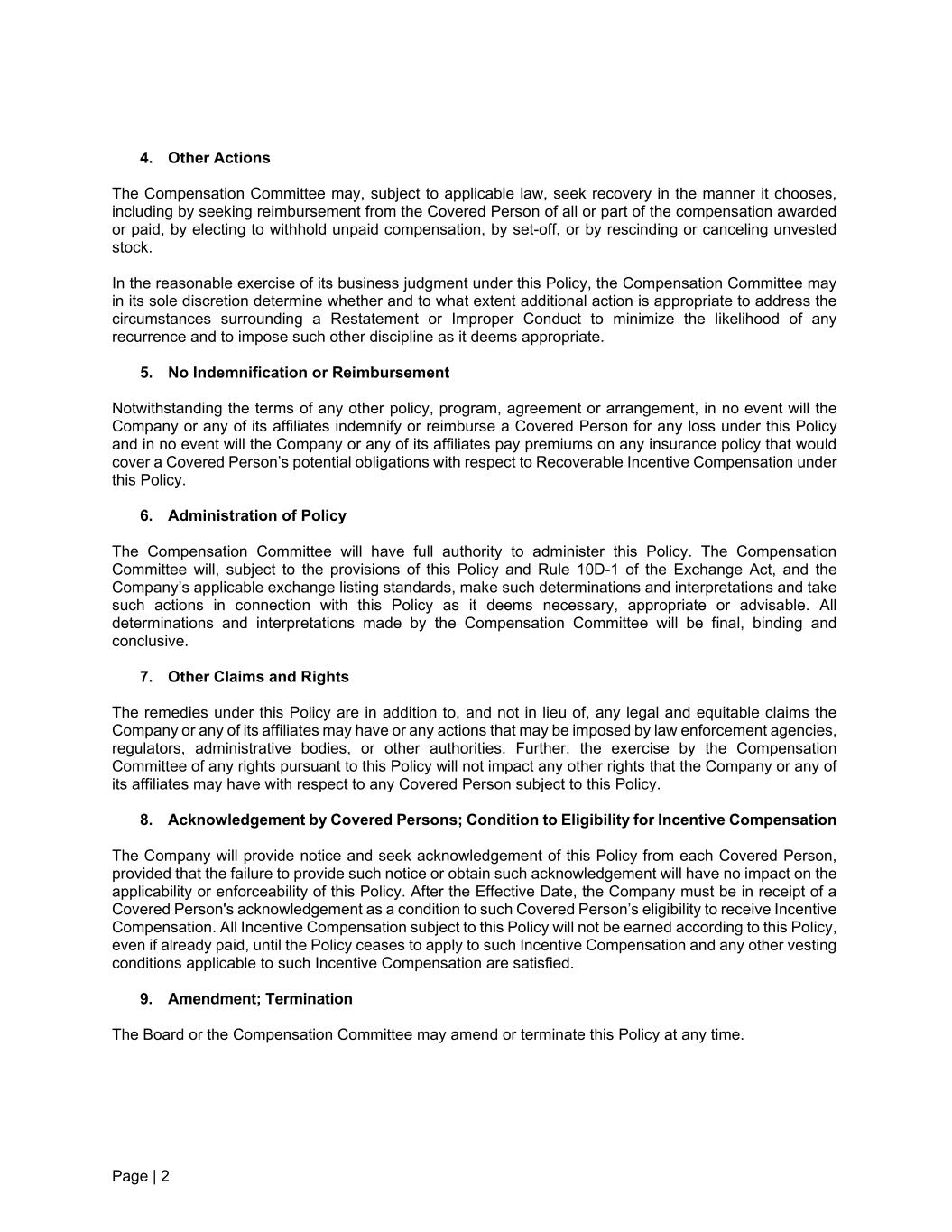 Page | 2 4. Other Actions The Compensation Committee may, subject to applicable law, seek recovery in the manner it chooses, including by seeking reimbursement from the Covered Person of all or part of the compensation awarded or paid, by electing to withhold unpaid compensation, by set-off, or by rescinding or canceling unvested stock. In the reasonable exercise of its business judgment under this Policy, the Compensation Committee may in its sole discretion determine whether and to what extent additional action is appropriate to address the circumstances surrounding a Restatement or Improper Conduct to minimize the likelihood of any recurrence and to impose such other discipline as it deems appropriate. 5. No Indemnification or Reimbursement Notwithstanding the terms of any other policy, program, agreement or arrangement, in no event will the Company or any of its affiliates indemnify or reimburse a Covered Person for any loss under this Policy and in no event will the Company or any of its affiliates pay premiums on any insurance policy that would cover a Covered Person’s potential obligations with respect to Recoverable Incentive Compensation under this Policy. 6. Administration of Policy The Compensation Committee will have full authority to administer this Policy. The Compensation Committee will, subject to the provisions of this Policy and Rule 10D-1 of the Exchange Act, and the Company’s applicable exchange listing standards, make such determinations and interpretations and take such actions in connection with this Policy as it deems necessary, appropriate or advisable. All determinations and interpretations made by the Compensation Committee will be final, binding and conclusive. 7. Other Claims and Rights The remedies under this Policy are in addition to, and not in lieu of, any legal and equitable claims the Company or any of its affiliates may have or any actions that may be imposed by law enforcement agencies, regulators, administrative bodies, or other authorities. Further, the exercise by the Compensation Committee of any rights pursuant to this Policy will not impact any other rights that the Company or any of its affiliates may have with respect to any Covered Person subject to this Policy. 8. Acknowledgement by Covered Persons; Condition to Eligibility for Incentive Compensation The Company will provide notice and seek acknowledgement of this Policy from each Covered Person, provided that the failure to provide such notice or obtain such acknowledgement will have no impact on the applicability or enforceability of this Policy. After the Effective Date, the Company must be in receipt of a Covered Person's acknowledgement as a condition to such Covered Person’s eligibility to receive Incentive Compensation. All Incentive Compensation subject to this Policy will not be earned according to this Policy, even if already paid, until the Policy ceases to apply to such Incentive Compensation and any other vesting conditions applicable to such Incentive Compensation are satisfied. 9. Amendment; Termination The Board or the Compensation Committee may amend or terminate this Policy at any time.
