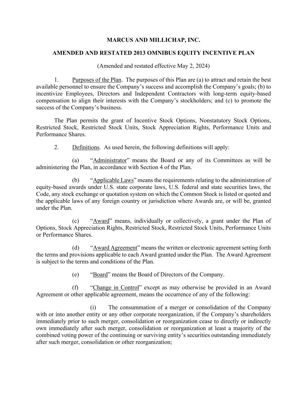 MARCUS AND MILLICHAP, INC. AMENDED AND RESTATED 2013 OMNIBUS EQUITY INCENTIVE PLAN (Amended and restated effective May 2, 2024) 1. Purposes of the Plan. The purposes of this Plan are (a) to attract and retain the best available personnel to ensure the Company’s success and accomplish the Company’s goals; (b) to incentivize Employees, Directors and Independent Contractors with long-term equity-based compensation to align their interests with the Company’s stockholders; and (c) to promote the success of the Company’s business. The Plan permits the grant of Incentive Stock Options, Nonstatutory Stock Options, Restricted Stock, Restricted Stock Units, Stock Appreciation Rights, Performance Units and Performance Shares. 2. Definitions. As used herein, the following definitions will apply: (a) “Administrator” means the Board or any of its Committees as will be administering the Plan, in accordance with Section 4 of the Plan. (b) “Applicable Laws” means the requirements relating to the administration of equity-based awards under U.S. state corporate laws, U.S. federal and state securities laws, the Code, any stock exchange or quotation system on which the Common Stock is listed or quoted and the applicable laws of any foreign country or jurisdiction where Awards are, or will be, granted under the Plan. (c) “Award” means, individually or collectively, a grant under the Plan of Options, Stock Appreciation Rights, Restricted Stock, Restricted Stock Units, Performance Units or Performance Shares. (d) “Award Agreement” means the written or electronic agreement setting forth the terms and provisions applicable to each Award granted under the Plan. The Award Agreement is subject to the terms and conditions of the Plan. (e) “Board” means the Board of Directors of the Company. (f) “Change in Control” except as may otherwise be provided in an Award Agreement or other applicable agreement, means the occurrence of any of the following: (i) The consummation of a merger or consolidation of the Company with or into another entity or any other corporate reorganization, if the Company’s shareholders immediately prior to such merger, consolidation or reorganization cease to directly or indirectly own immediately after such merger, consolidation or reorganization at least a majority of the combined voting power of the continuing or surviving entity’s securities outstanding immediately after such merger, consolidation or other reorganization;