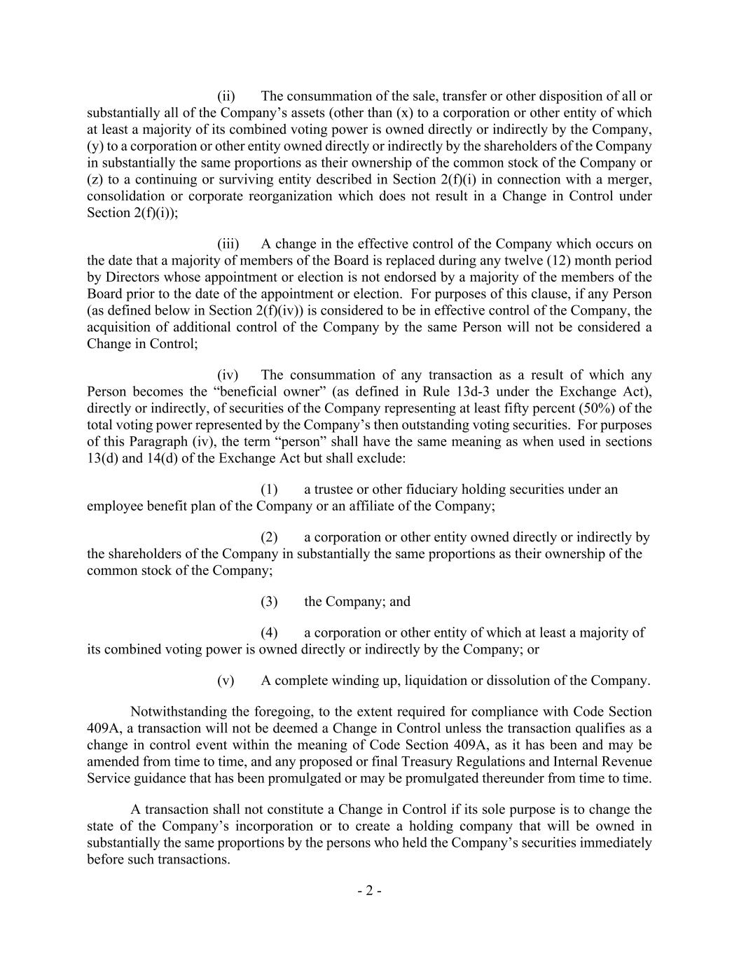 - 2 - (ii) The consummation of the sale, transfer or other disposition of all or substantially all of the Company’s assets (other than (x) to a corporation or other entity of which at least a majority of its combined voting power is owned directly or indirectly by the Company, (y) to a corporation or other entity owned directly or indirectly by the shareholders of the Company in substantially the same proportions as their ownership of the common stock of the Company or (z) to a continuing or surviving entity described in Section 2(f)(i) in connection with a merger, consolidation or corporate reorganization which does not result in a Change in Control under Section 2(f)(i)); (iii) A change in the effective control of the Company which occurs on the date that a majority of members of the Board is replaced during any twelve (12) month period by Directors whose appointment or election is not endorsed by a majority of the members of the Board prior to the date of the appointment or election. For purposes of this clause, if any Person (as defined below in Section 2(f)(iv)) is considered to be in effective control of the Company, the acquisition of additional control of the Company by the same Person will not be considered a Change in Control; (iv) The consummation of any transaction as a result of which any Person becomes the “beneficial owner” (as defined in Rule 13d-3 under the Exchange Act), directly or indirectly, of securities of the Company representing at least fifty percent (50%) of the total voting power represented by the Company’s then outstanding voting securities. For purposes of this Paragraph (iv), the term “person” shall have the same meaning as when used in sections 13(d) and 14(d) of the Exchange Act but shall exclude: (1) a trustee or other fiduciary holding securities under an employee benefit plan of the Company or an affiliate of the Company; (2) a corporation or other entity owned directly or indirectly by the shareholders of the Company in substantially the same proportions as their ownership of the common stock of the Company; (3) the Company; and (4) a corporation or other entity of which at least a majority of its combined voting power is owned directly or indirectly by the Company; or (v) A complete winding up, liquidation or dissolution of the Company. Notwithstanding the foregoing, to the extent required for compliance with Code Section 409A, a transaction will not be deemed a Change in Control unless the transaction qualifies as a change in control event within the meaning of Code Section 409A, as it has been and may be amended from time to time, and any proposed or final Treasury Regulations and Internal Revenue Service guidance that has been promulgated or may be promulgated thereunder from time to time. A transaction shall not constitute a Change in Control if its sole purpose is to change the state of the Company’s incorporation or to create a holding company that will be owned in substantially the same proportions by the persons who held the Company’s securities immediately before such transactions.