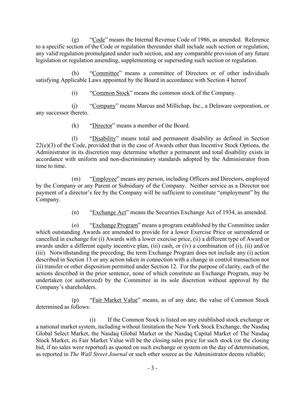 - 3 - (g) “Code” means the Internal Revenue Code of 1986, as amended. Reference to a specific section of the Code or regulation thereunder shall include such section or regulation, any valid regulation promulgated under such section, and any comparable provision of any future legislation or regulation amending, supplementing or superseding such section or regulation. (h) “Committee” means a committee of Directors or of other individuals satisfying Applicable Laws appointed by the Board in accordance with Section 4 hereof (i) “Common Stock” means the common stock of the Company. (j) “Company” means Marcus and Millichap, Inc., a Delaware corporation, or any successor thereto. (k) “Director” means a member of the Board. (l) “Disability” means total and permanent disability as defined in Section 22(e)(3) of the Code, provided that in the case of Awards other than Incentive Stock Options, the Administrator in its discretion may determine whether a permanent and total disability exists in accordance with uniform and non-discriminatory standards adopted by the Administrator from time to time. (m) “Employee” means any person, including Officers and Directors, employed by the Company or any Parent or Subsidiary of the Company. Neither service as a Director nor payment of a director’s fee by the Company will be sufficient to constitute “employment” by the Company. (n) “Exchange Act” means the Securities Exchange Act of 1934, as amended. (o) “Exchange Program” means a program established by the Committee under which outstanding Awards are amended to provide for a lower Exercise Price or surrendered or cancelled in exchange for (i) Awards with a lower exercise price, (ii) a different type of Award or awards under a different equity incentive plan, (iii) cash, or (iv) a combination of (i), (ii) and/or (iii). Notwithstanding the preceding, the term Exchange Program does not include any (i) action described in Section 13 or any action taken in connection with a change in control transaction nor (ii) transfer or other disposition permitted under Section 12. For the purpose of clarity, each of the actions described in the prior sentence, none of which constitute an Exchange Program, may be undertaken (or authorized) by the Committee in its sole discretion without approval by the Company’s shareholders. (p) “Fair Market Value” means, as of any date, the value of Common Stock determined as follows: (i) If the Common Stock is listed on any established stock exchange or a national market system, including without limitation the New York Stock Exchange, the Nasdaq Global Select Market, the Nasdaq Global Market or the Nasdaq Capital Market of The Nasdaq Stock Market, its Fair Market Value will be the closing sales price for such stock (or the closing bid, if no sales were reported) as quoted on such exchange or system on the day of determination, as reported in The Wall Street Journal or such other source as the Administrator deems reliable;