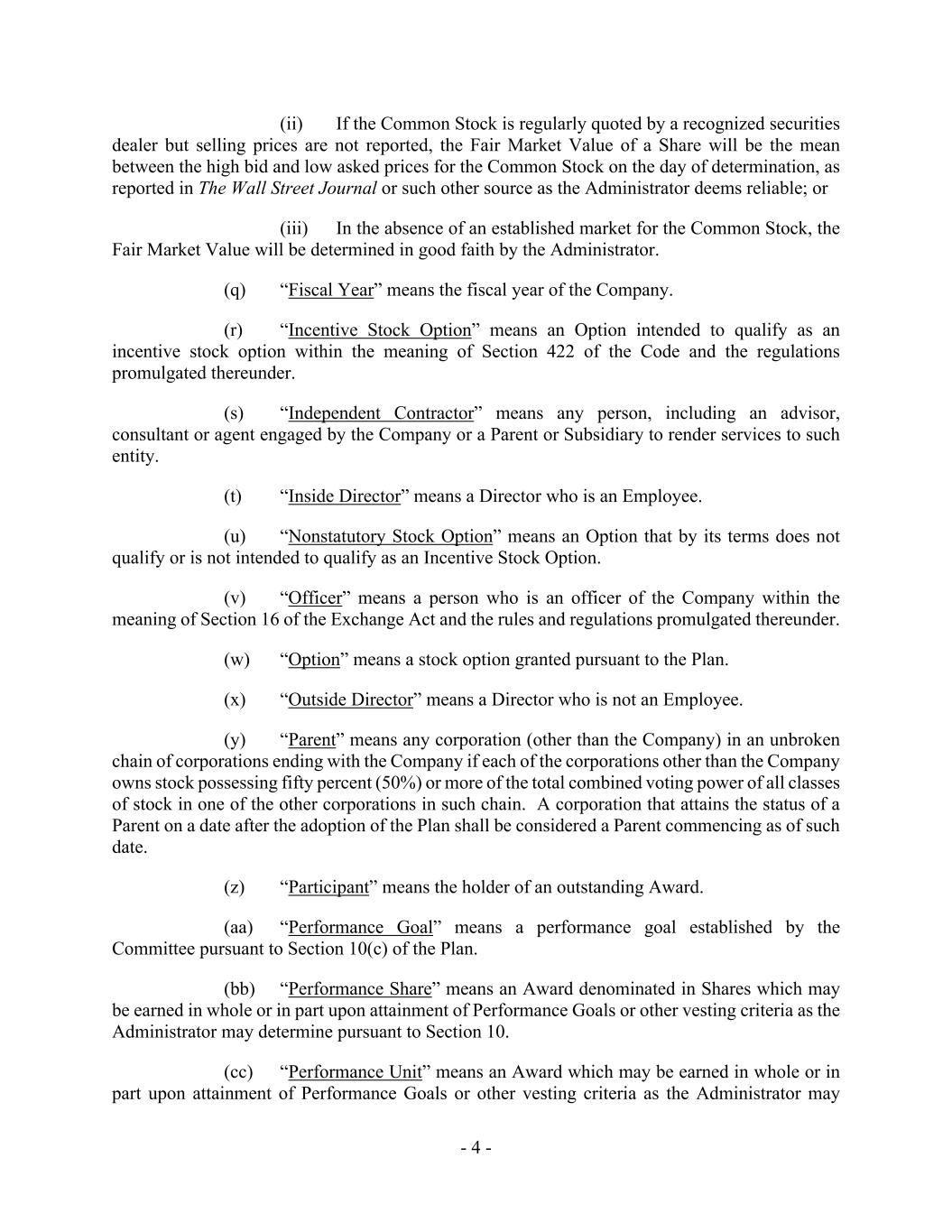 - 4 - (ii) If the Common Stock is regularly quoted by a recognized securities dealer but selling prices are not reported, the Fair Market Value of a Share will be the mean between the high bid and low asked prices for the Common Stock on the day of determination, as reported in The Wall Street Journal or such other source as the Administrator deems reliable; or (iii) In the absence of an established market for the Common Stock, the Fair Market Value will be determined in good faith by the Administrator. (q) “Fiscal Year” means the fiscal year of the Company. (r) “Incentive Stock Option” means an Option intended to qualify as an incentive stock option within the meaning of Section 422 of the Code and the regulations promulgated thereunder. (s) “Independent Contractor” means any person, including an advisor, consultant or agent engaged by the Company or a Parent or Subsidiary to render services to such entity. (t) “Inside Director” means a Director who is an Employee. (u) “Nonstatutory Stock Option” means an Option that by its terms does not qualify or is not intended to qualify as an Incentive Stock Option. (v) “Officer” means a person who is an officer of the Company within the meaning of Section 16 of the Exchange Act and the rules and regulations promulgated thereunder. (w) “Option” means a stock option granted pursuant to the Plan. (x) “Outside Director” means a Director who is not an Employee. (y) “Parent” means any corporation (other than the Company) in an unbroken chain of corporations ending with the Company if each of the corporations other than the Company owns stock possessing fifty percent (50%) or more of the total combined voting power of all classes of stock in one of the other corporations in such chain. A corporation that attains the status of a Parent on a date after the adoption of the Plan shall be considered a Parent commencing as of such date. (z) “Participant” means the holder of an outstanding Award. (aa) “Performance Goal” means a performance goal established by the Committee pursuant to Section 10(c) of the Plan. (bb) “Performance Share” means an Award denominated in Shares which may be earned in whole or in part upon attainment of Performance Goals or other vesting criteria as the Administrator may determine pursuant to Section 10. (cc) “Performance Unit” means an Award which may be earned in whole or in part upon attainment of Performance Goals or other vesting criteria as the Administrator may