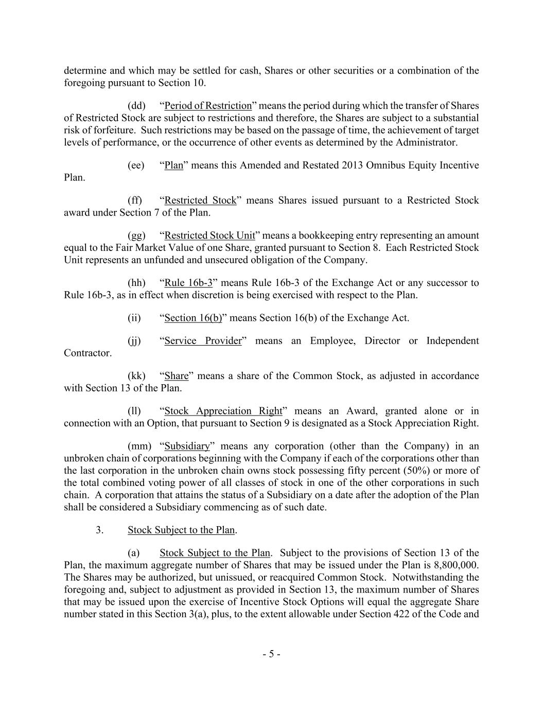 - 5 - determine and which may be settled for cash, Shares or other securities or a combination of the foregoing pursuant to Section 10. (dd) “Period of Restriction” means the period during which the transfer of Shares of Restricted Stock are subject to restrictions and therefore, the Shares are subject to a substantial risk of forfeiture. Such restrictions may be based on the passage of time, the achievement of target levels of performance, or the occurrence of other events as determined by the Administrator. (ee) “Plan” means this Amended and Restated 2013 Omnibus Equity Incentive Plan. (ff) “Restricted Stock” means Shares issued pursuant to a Restricted Stock award under Section 7 of the Plan. (gg) “Restricted Stock Unit” means a bookkeeping entry representing an amount equal to the Fair Market Value of one Share, granted pursuant to Section 8. Each Restricted Stock Unit represents an unfunded and unsecured obligation of the Company. (hh) “Rule 16b-3” means Rule 16b-3 of the Exchange Act or any successor to Rule 16b-3, as in effect when discretion is being exercised with respect to the Plan. (ii) “Section 16(b)” means Section 16(b) of the Exchange Act. (jj) “Service Provider” means an Employee, Director or Independent Contractor. (kk) “Share” means a share of the Common Stock, as adjusted in accordance with Section 13 of the Plan. (ll) “Stock Appreciation Right” means an Award, granted alone or in connection with an Option, that pursuant to Section 9 is designated as a Stock Appreciation Right. (mm) “Subsidiary” means any corporation (other than the Company) in an unbroken chain of corporations beginning with the Company if each of the corporations other than the last corporation in the unbroken chain owns stock possessing fifty percent (50%) or more of the total combined voting power of all classes of stock in one of the other corporations in such chain. A corporation that attains the status of a Subsidiary on a date after the adoption of the Plan shall be considered a Subsidiary commencing as of such date. 3. Stock Subject to the Plan. (a) Stock Subject to the Plan. Subject to the provisions of Section 13 of the Plan, the maximum aggregate number of Shares that may be issued under the Plan is 8,800,000. The Shares may be authorized, but unissued, or reacquired Common Stock. Notwithstanding the foregoing and, subject to adjustment as provided in Section 13, the maximum number of Shares that may be issued upon the exercise of Incentive Stock Options will equal the aggregate Share number stated in this Section 3(a), plus, to the extent allowable under Section 422 of the Code and
