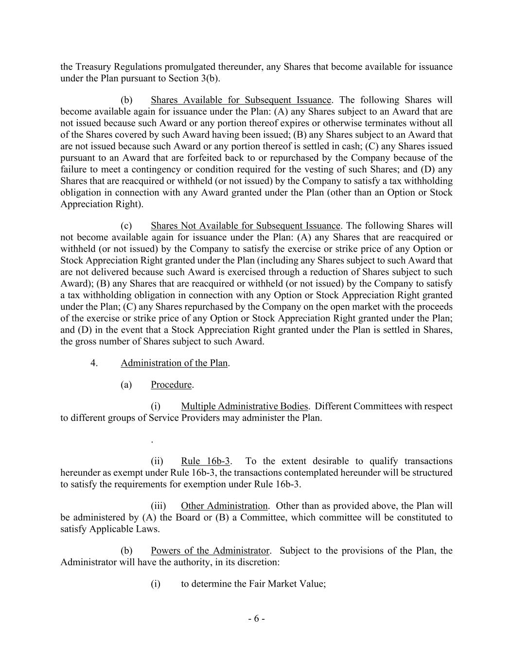 - 6 - the Treasury Regulations promulgated thereunder, any Shares that become available for issuance under the Plan pursuant to Section 3(b). (b) Shares Available for Subsequent Issuance. The following Shares will become available again for issuance under the Plan: (A) any Shares subject to an Award that are not issued because such Award or any portion thereof expires or otherwise terminates without all of the Shares covered by such Award having been issued; (B) any Shares subject to an Award that are not issued because such Award or any portion thereof is settled in cash; (C) any Shares issued pursuant to an Award that are forfeited back to or repurchased by the Company because of the failure to meet a contingency or condition required for the vesting of such Shares; and (D) any Shares that are reacquired or withheld (or not issued) by the Company to satisfy a tax withholding obligation in connection with any Award granted under the Plan (other than an Option or Stock Appreciation Right). (c) Shares Not Available for Subsequent Issuance. The following Shares will not become available again for issuance under the Plan: (A) any Shares that are reacquired or withheld (or not issued) by the Company to satisfy the exercise or strike price of any Option or Stock Appreciation Right granted under the Plan (including any Shares subject to such Award that are not delivered because such Award is exercised through a reduction of Shares subject to such Award); (B) any Shares that are reacquired or withheld (or not issued) by the Company to satisfy a tax withholding obligation in connection with any Option or Stock Appreciation Right granted under the Plan; (C) any Shares repurchased by the Company on the open market with the proceeds of the exercise or strike price of any Option or Stock Appreciation Right granted under the Plan; and (D) in the event that a Stock Appreciation Right granted under the Plan is settled in Shares, the gross number of Shares subject to such Award. 4. Administration of the Plan. (a) Procedure. (i) Multiple Administrative Bodies. Different Committees with respect to different groups of Service Providers may administer the Plan. . (ii) Rule 16b-3. To the extent desirable to qualify transactions hereunder as exempt under Rule 16b-3, the transactions contemplated hereunder will be structured to satisfy the requirements for exemption under Rule 16b-3. (iii) Other Administration. Other than as provided above, the Plan will be administered by (A) the Board or (B) a Committee, which committee will be constituted to satisfy Applicable Laws. (b) Powers of the Administrator. Subject to the provisions of the Plan, the Administrator will have the authority, in its discretion: (i) to determine the Fair Market Value;