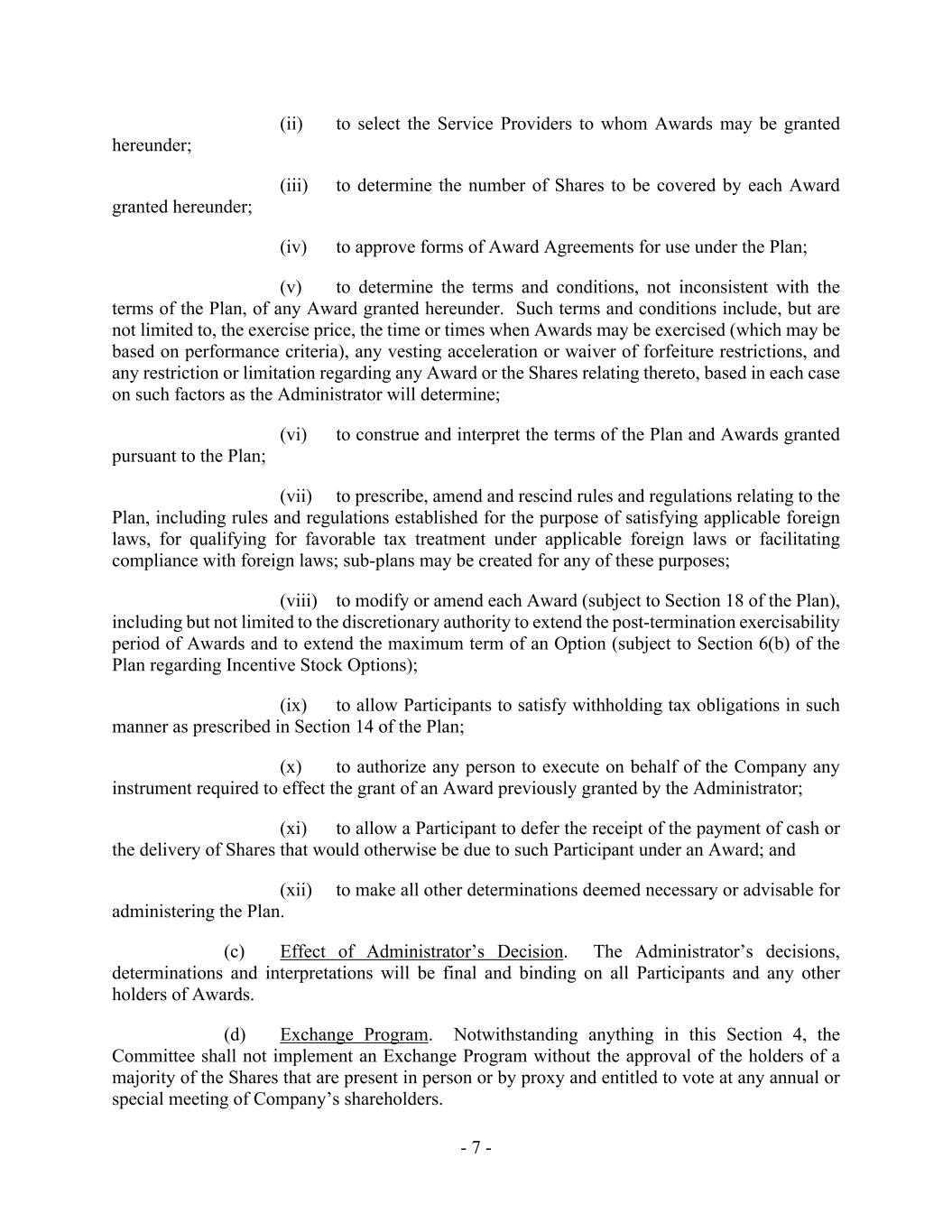 - 7 - (ii) to select the Service Providers to whom Awards may be granted hereunder; (iii) to determine the number of Shares to be covered by each Award granted hereunder; (iv) to approve forms of Award Agreements for use under the Plan; (v) to determine the terms and conditions, not inconsistent with the terms of the Plan, of any Award granted hereunder. Such terms and conditions include, but are not limited to, the exercise price, the time or times when Awards may be exercised (which may be based on performance criteria), any vesting acceleration or waiver of forfeiture restrictions, and any restriction or limitation regarding any Award or the Shares relating thereto, based in each case on such factors as the Administrator will determine; (vi) to construe and interpret the terms of the Plan and Awards granted pursuant to the Plan; (vii) to prescribe, amend and rescind rules and regulations relating to the Plan, including rules and regulations established for the purpose of satisfying applicable foreign laws, for qualifying for favorable tax treatment under applicable foreign laws or facilitating compliance with foreign laws; sub-plans may be created for any of these purposes; (viii) to modify or amend each Award (subject to Section 18 of the Plan), including but not limited to the discretionary authority to extend the post-termination exercisability period of Awards and to extend the maximum term of an Option (subject to Section 6(b) of the Plan regarding Incentive Stock Options); (ix) to allow Participants to satisfy withholding tax obligations in such manner as prescribed in Section 14 of the Plan; (x) to authorize any person to execute on behalf of the Company any instrument required to effect the grant of an Award previously granted by the Administrator; (xi) to allow a Participant to defer the receipt of the payment of cash or the delivery of Shares that would otherwise be due to such Participant under an Award; and (xii) to make all other determinations deemed necessary or advisable for administering the Plan. (c) Effect of Administrator’s Decision. The Administrator’s decisions, determinations and interpretations will be final and binding on all Participants and any other holders of Awards. (d) Exchange Program. Notwithstanding anything in this Section 4, the Committee shall not implement an Exchange Program without the approval of the holders of a majority of the Shares that are present in person or by proxy and entitled to vote at any annual or special meeting of Company’s shareholders.