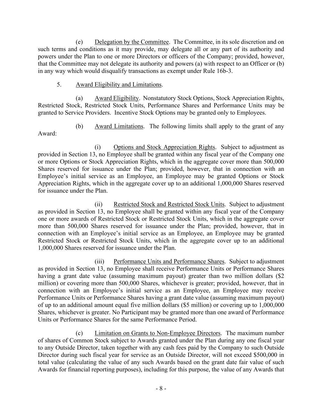 - 8 - (e) Delegation by the Committee. The Committee, in its sole discretion and on such terms and conditions as it may provide, may delegate all or any part of its authority and powers under the Plan to one or more Directors or officers of the Company; provided, however, that the Committee may not delegate its authority and powers (a) with respect to an Officer or (b) in any way which would disqualify transactions as exempt under Rule 16b-3. 5. Award Eligibility and Limitations. (a) Award Eligibility. Nonstatutory Stock Options, Stock Appreciation Rights, Restricted Stock, Restricted Stock Units, Performance Shares and Performance Units may be granted to Service Providers. Incentive Stock Options may be granted only to Employees. (b) Award Limitations. The following limits shall apply to the grant of any Award: (i) Options and Stock Appreciation Rights. Subject to adjustment as provided in Section 13, no Employee shall be granted within any fiscal year of the Company one or more Options or Stock Appreciation Rights, which in the aggregate cover more than 500,000 Shares reserved for issuance under the Plan; provided, however, that in connection with an Employee’s initial service as an Employee, an Employee may be granted Options or Stock Appreciation Rights, which in the aggregate cover up to an additional 1,000,000 Shares reserved for issuance under the Plan. (ii) Restricted Stock and Restricted Stock Units. Subject to adjustment as provided in Section 13, no Employee shall be granted within any fiscal year of the Company one or more awards of Restricted Stock or Restricted Stock Units, which in the aggregate cover more than 500,000 Shares reserved for issuance under the Plan; provided, however, that in connection with an Employee’s initial service as an Employee, an Employee may be granted Restricted Stock or Restricted Stock Units, which in the aggregate cover up to an additional 1,000,000 Shares reserved for issuance under the Plan. (iii) Performance Units and Performance Shares. Subject to adjustment as provided in Section 13, no Employee shall receive Performance Units or Performance Shares having a grant date value (assuming maximum payout) greater than two million dollars ($2 million) or covering more than 500,000 Shares, whichever is greater; provided, however, that in connection with an Employee’s initial service as an Employee, an Employee may receive Performance Units or Performance Shares having a grant date value (assuming maximum payout) of up to an additional amount equal five million dollars ($5 million) or covering up to 1,000,000 Shares, whichever is greater. No Participant may be granted more than one award of Performance Units or Performance Shares for the same Performance Period. (c) Limitation on Grants to Non-Employee Directors. The maximum number of shares of Common Stock subject to Awards granted under the Plan during any one fiscal year to any Outside Director, taken together with any cash fees paid by the Company to such Outside Director during such fiscal year for service as an Outside Director, will not exceed $500,000 in total value (calculating the value of any such Awards based on the grant date fair value of such Awards for financial reporting purposes), including for this purpose, the value of any Awards that