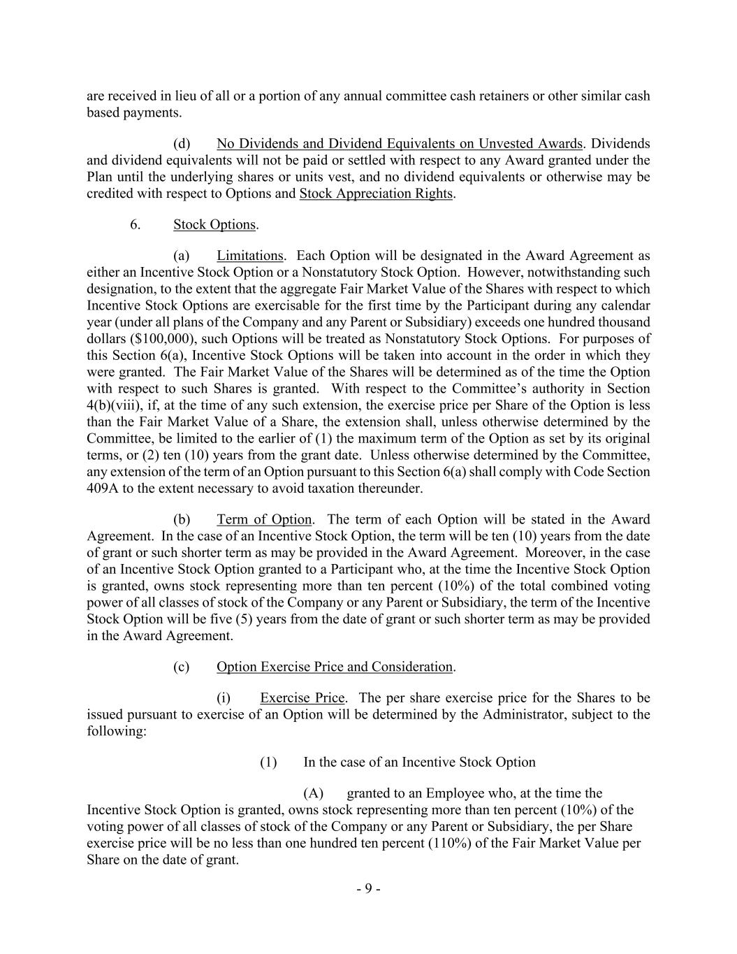 - 9 - are received in lieu of all or a portion of any annual committee cash retainers or other similar cash based payments. (d) No Dividends and Dividend Equivalents on Unvested Awards. Dividends and dividend equivalents will not be paid or settled with respect to any Award granted under the Plan until the underlying shares or units vest, and no dividend equivalents or otherwise may be credited with respect to Options and Stock Appreciation Rights. 6. Stock Options. (a) Limitations. Each Option will be designated in the Award Agreement as either an Incentive Stock Option or a Nonstatutory Stock Option. However, notwithstanding such designation, to the extent that the aggregate Fair Market Value of the Shares with respect to which Incentive Stock Options are exercisable for the first time by the Participant during any calendar year (under all plans of the Company and any Parent or Subsidiary) exceeds one hundred thousand dollars ($100,000), such Options will be treated as Nonstatutory Stock Options. For purposes of this Section 6(a), Incentive Stock Options will be taken into account in the order in which they were granted. The Fair Market Value of the Shares will be determined as of the time the Option with respect to such Shares is granted. With respect to the Committee’s authority in Section 4(b)(viii), if, at the time of any such extension, the exercise price per Share of the Option is less than the Fair Market Value of a Share, the extension shall, unless otherwise determined by the Committee, be limited to the earlier of (1) the maximum term of the Option as set by its original terms, or (2) ten (10) years from the grant date. Unless otherwise determined by the Committee, any extension of the term of an Option pursuant to this Section 6(a) shall comply with Code Section 409A to the extent necessary to avoid taxation thereunder. (b) Term of Option. The term of each Option will be stated in the Award Agreement. In the case of an Incentive Stock Option, the term will be ten (10) years from the date of grant or such shorter term as may be provided in the Award Agreement. Moreover, in the case of an Incentive Stock Option granted to a Participant who, at the time the Incentive Stock Option is granted, owns stock representing more than ten percent (10%) of the total combined voting power of all classes of stock of the Company or any Parent or Subsidiary, the term of the Incentive Stock Option will be five (5) years from the date of grant or such shorter term as may be provided in the Award Agreement. (c) Option Exercise Price and Consideration. (i) Exercise Price. The per share exercise price for the Shares to be issued pursuant to exercise of an Option will be determined by the Administrator, subject to the following: (1) In the case of an Incentive Stock Option (A) granted to an Employee who, at the time the Incentive Stock Option is granted, owns stock representing more than ten percent (10%) of the voting power of all classes of stock of the Company or any Parent or Subsidiary, the per Share exercise price will be no less than one hundred ten percent (110%) of the Fair Market Value per Share on the date of grant.