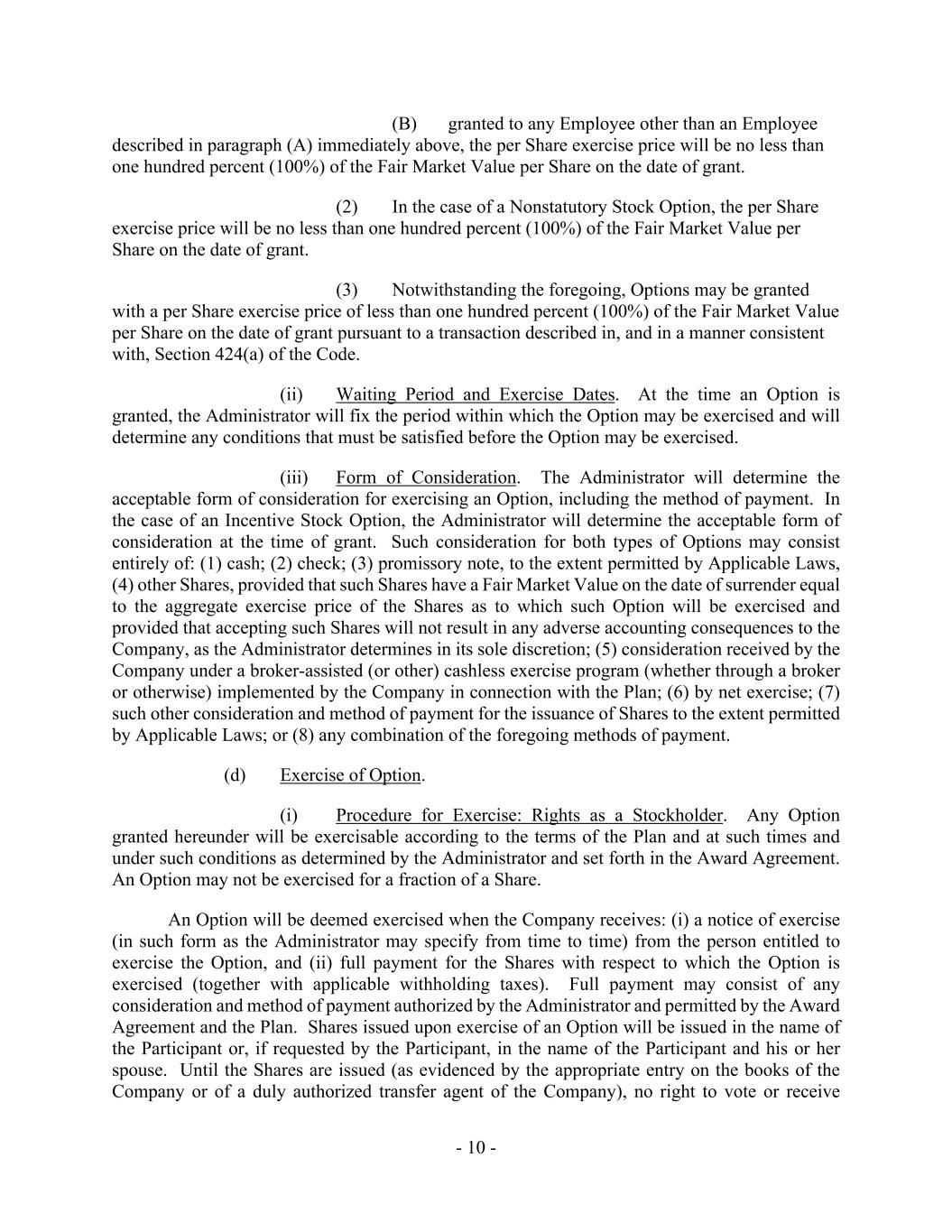 - 10 - (B) granted to any Employee other than an Employee described in paragraph (A) immediately above, the per Share exercise price will be no less than one hundred percent (100%) of the Fair Market Value per Share on the date of grant. (2) In the case of a Nonstatutory Stock Option, the per Share exercise price will be no less than one hundred percent (100%) of the Fair Market Value per Share on the date of grant. (3) Notwithstanding the foregoing, Options may be granted with a per Share exercise price of less than one hundred percent (100%) of the Fair Market Value per Share on the date of grant pursuant to a transaction described in, and in a manner consistent with, Section 424(a) of the Code. (ii) Waiting Period and Exercise Dates. At the time an Option is granted, the Administrator will fix the period within which the Option may be exercised and will determine any conditions that must be satisfied before the Option may be exercised. (iii) Form of Consideration. The Administrator will determine the acceptable form of consideration for exercising an Option, including the method of payment. In the case of an Incentive Stock Option, the Administrator will determine the acceptable form of consideration at the time of grant. Such consideration for both types of Options may consist entirely of: (1) cash; (2) check; (3) promissory note, to the extent permitted by Applicable Laws, (4) other Shares, provided that such Shares have a Fair Market Value on the date of surrender equal to the aggregate exercise price of the Shares as to which such Option will be exercised and provided that accepting such Shares will not result in any adverse accounting consequences to the Company, as the Administrator determines in its sole discretion; (5) consideration received by the Company under a broker-assisted (or other) cashless exercise program (whether through a broker or otherwise) implemented by the Company in connection with the Plan; (6) by net exercise; (7) such other consideration and method of payment for the issuance of Shares to the extent permitted by Applicable Laws; or (8) any combination of the foregoing methods of payment. (d) Exercise of Option. (i) Procedure for Exercise: Rights as a Stockholder. Any Option granted hereunder will be exercisable according to the terms of the Plan and at such times and under such conditions as determined by the Administrator and set forth in the Award Agreement. An Option may not be exercised for a fraction of a Share. An Option will be deemed exercised when the Company receives: (i) a notice of exercise (in such form as the Administrator may specify from time to time) from the person entitled to exercise the Option, and (ii) full payment for the Shares with respect to which the Option is exercised (together with applicable withholding taxes). Full payment may consist of any consideration and method of payment authorized by the Administrator and permitted by the Award Agreement and the Plan. Shares issued upon exercise of an Option will be issued in the name of the Participant or, if requested by the Participant, in the name of the Participant and his or her spouse. Until the Shares are issued (as evidenced by the appropriate entry on the books of the Company or of a duly authorized transfer agent of the Company), no right to vote or receive
