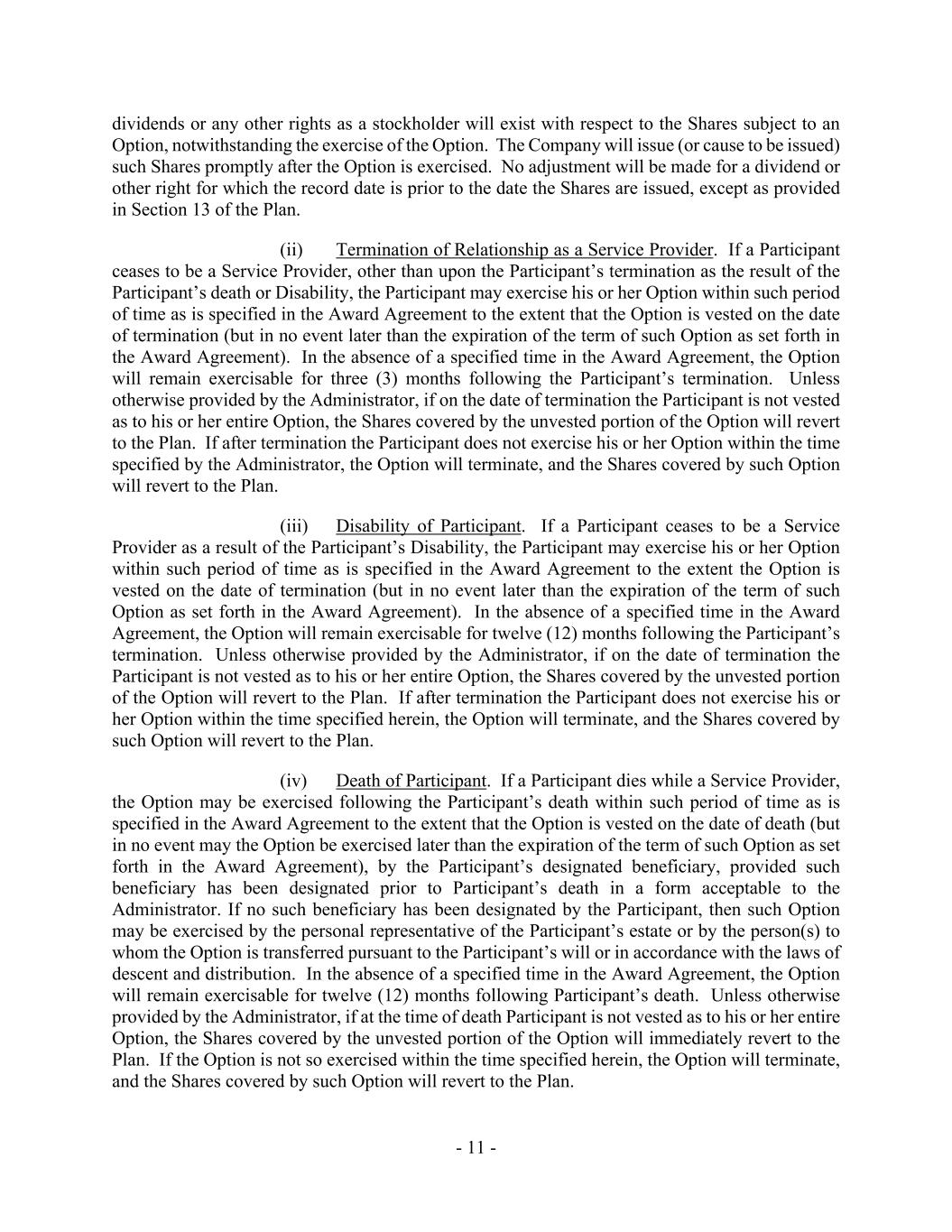 - 11 - dividends or any other rights as a stockholder will exist with respect to the Shares subject to an Option, notwithstanding the exercise of the Option. The Company will issue (or cause to be issued) such Shares promptly after the Option is exercised. No adjustment will be made for a dividend or other right for which the record date is prior to the date the Shares are issued, except as provided in Section 13 of the Plan. (ii) Termination of Relationship as a Service Provider. If a Participant ceases to be a Service Provider, other than upon the Participant’s termination as the result of the Participant’s death or Disability, the Participant may exercise his or her Option within such period of time as is specified in the Award Agreement to the extent that the Option is vested on the date of termination (but in no event later than the expiration of the term of such Option as set forth in the Award Agreement). In the absence of a specified time in the Award Agreement, the Option will remain exercisable for three (3) months following the Participant’s termination. Unless otherwise provided by the Administrator, if on the date of termination the Participant is not vested as to his or her entire Option, the Shares covered by the unvested portion of the Option will revert to the Plan. If after termination the Participant does not exercise his or her Option within the time specified by the Administrator, the Option will terminate, and the Shares covered by such Option will revert to the Plan. (iii) Disability of Participant. If a Participant ceases to be a Service Provider as a result of the Participant’s Disability, the Participant may exercise his or her Option within such period of time as is specified in the Award Agreement to the extent the Option is vested on the date of termination (but in no event later than the expiration of the term of such Option as set forth in the Award Agreement). In the absence of a specified time in the Award Agreement, the Option will remain exercisable for twelve (12) months following the Participant’s termination. Unless otherwise provided by the Administrator, if on the date of termination the Participant is not vested as to his or her entire Option, the Shares covered by the unvested portion of the Option will revert to the Plan. If after termination the Participant does not exercise his or her Option within the time specified herein, the Option will terminate, and the Shares covered by such Option will revert to the Plan. (iv) Death of Participant. If a Participant dies while a Service Provider, the Option may be exercised following the Participant’s death within such period of time as is specified in the Award Agreement to the extent that the Option is vested on the date of death (but in no event may the Option be exercised later than the expiration of the term of such Option as set forth in the Award Agreement), by the Participant’s designated beneficiary, provided such beneficiary has been designated prior to Participant’s death in a form acceptable to the Administrator. If no such beneficiary has been designated by the Participant, then such Option may be exercised by the personal representative of the Participant’s estate or by the person(s) to whom the Option is transferred pursuant to the Participant’s will or in accordance with the laws of descent and distribution. In the absence of a specified time in the Award Agreement, the Option will remain exercisable for twelve (12) months following Participant’s death. Unless otherwise provided by the Administrator, if at the time of death Participant is not vested as to his or her entire Option, the Shares covered by the unvested portion of the Option will immediately revert to the Plan. If the Option is not so exercised within the time specified herein, the Option will terminate, and the Shares covered by such Option will revert to the Plan.
