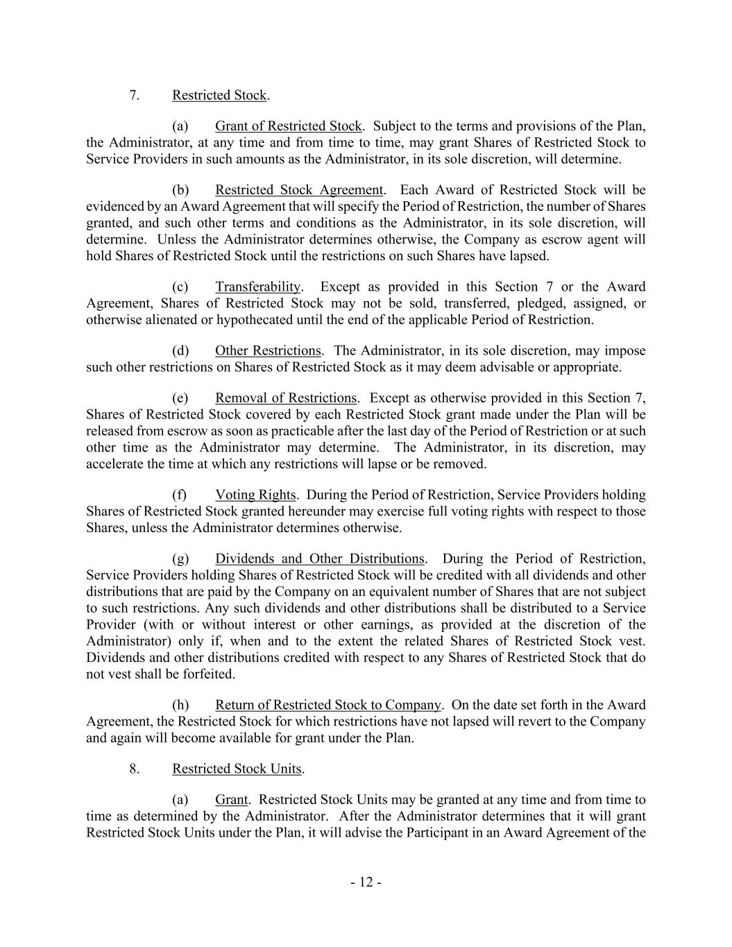 - 12 - 7. Restricted Stock. (a) Grant of Restricted Stock. Subject to the terms and provisions of the Plan, the Administrator, at any time and from time to time, may grant Shares of Restricted Stock to Service Providers in such amounts as the Administrator, in its sole discretion, will determine. (b) Restricted Stock Agreement. Each Award of Restricted Stock will be evidenced by an Award Agreement that will specify the Period of Restriction, the number of Shares granted, and such other terms and conditions as the Administrator, in its sole discretion, will determine. Unless the Administrator determines otherwise, the Company as escrow agent will hold Shares of Restricted Stock until the restrictions on such Shares have lapsed. (c) Transferability. Except as provided in this Section 7 or the Award Agreement, Shares of Restricted Stock may not be sold, transferred, pledged, assigned, or otherwise alienated or hypothecated until the end of the applicable Period of Restriction. (d) Other Restrictions. The Administrator, in its sole discretion, may impose such other restrictions on Shares of Restricted Stock as it may deem advisable or appropriate. (e) Removal of Restrictions. Except as otherwise provided in this Section 7, Shares of Restricted Stock covered by each Restricted Stock grant made under the Plan will be released from escrow as soon as practicable after the last day of the Period of Restriction or at such other time as the Administrator may determine. The Administrator, in its discretion, may accelerate the time at which any restrictions will lapse or be removed. (f) Voting Rights. During the Period of Restriction, Service Providers holding Shares of Restricted Stock granted hereunder may exercise full voting rights with respect to those Shares, unless the Administrator determines otherwise. (g) Dividends and Other Distributions. During the Period of Restriction, Service Providers holding Shares of Restricted Stock will be credited with all dividends and other distributions that are paid by the Company on an equivalent number of Shares that are not subject to such restrictions. Any such dividends and other distributions shall be distributed to a Service Provider (with or without interest or other earnings, as provided at the discretion of the Administrator) only if, when and to the extent the related Shares of Restricted Stock vest. Dividends and other distributions credited with respect to any Shares of Restricted Stock that do not vest shall be forfeited. (h) Return of Restricted Stock to Company. On the date set forth in the Award Agreement, the Restricted Stock for which restrictions have not lapsed will revert to the Company and again will become available for grant under the Plan. 8. Restricted Stock Units. (a) Grant. Restricted Stock Units may be granted at any time and from time to time as determined by the Administrator. After the Administrator determines that it will grant Restricted Stock Units under the Plan, it will advise the Participant in an Award Agreement of the