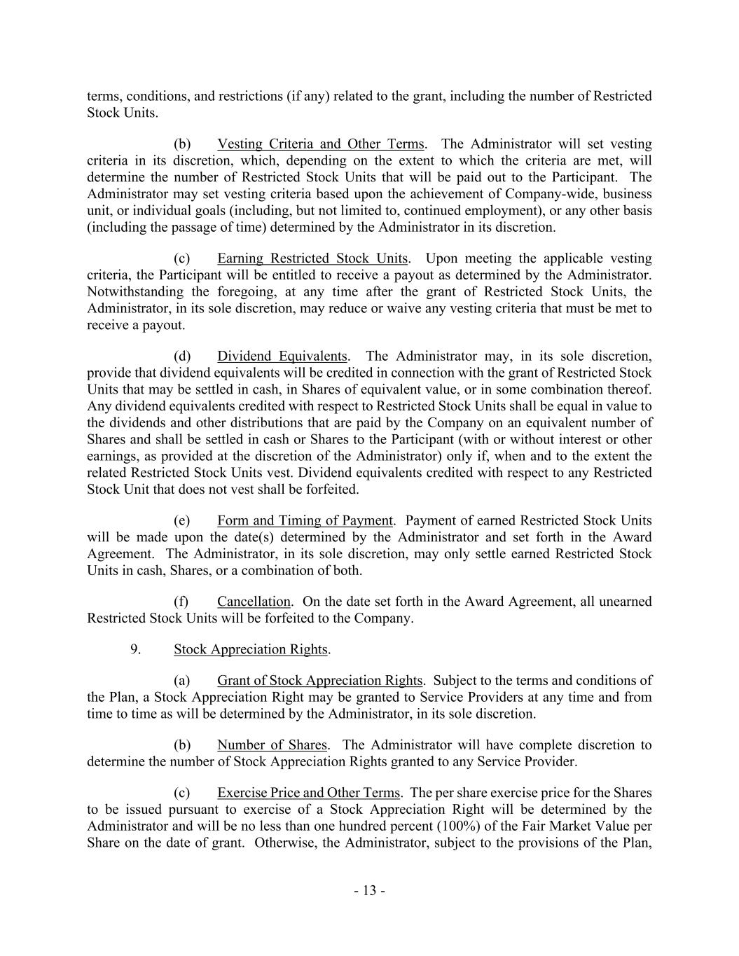 - 13 - terms, conditions, and restrictions (if any) related to the grant, including the number of Restricted Stock Units. (b) Vesting Criteria and Other Terms. The Administrator will set vesting criteria in its discretion, which, depending on the extent to which the criteria are met, will determine the number of Restricted Stock Units that will be paid out to the Participant. The Administrator may set vesting criteria based upon the achievement of Company-wide, business unit, or individual goals (including, but not limited to, continued employment), or any other basis (including the passage of time) determined by the Administrator in its discretion. (c) Earning Restricted Stock Units. Upon meeting the applicable vesting criteria, the Participant will be entitled to receive a payout as determined by the Administrator. Notwithstanding the foregoing, at any time after the grant of Restricted Stock Units, the Administrator, in its sole discretion, may reduce or waive any vesting criteria that must be met to receive a payout. (d) Dividend Equivalents. The Administrator may, in its sole discretion, provide that dividend equivalents will be credited in connection with the grant of Restricted Stock Units that may be settled in cash, in Shares of equivalent value, or in some combination thereof. Any dividend equivalents credited with respect to Restricted Stock Units shall be equal in value to the dividends and other distributions that are paid by the Company on an equivalent number of Shares and shall be settled in cash or Shares to the Participant (with or without interest or other earnings, as provided at the discretion of the Administrator) only if, when and to the extent the related Restricted Stock Units vest. Dividend equivalents credited with respect to any Restricted Stock Unit that does not vest shall be forfeited. (e) Form and Timing of Payment. Payment of earned Restricted Stock Units will be made upon the date(s) determined by the Administrator and set forth in the Award Agreement. The Administrator, in its sole discretion, may only settle earned Restricted Stock Units in cash, Shares, or a combination of both. (f) Cancellation. On the date set forth in the Award Agreement, all unearned Restricted Stock Units will be forfeited to the Company. 9. Stock Appreciation Rights. (a) Grant of Stock Appreciation Rights. Subject to the terms and conditions of the Plan, a Stock Appreciation Right may be granted to Service Providers at any time and from time to time as will be determined by the Administrator, in its sole discretion. (b) Number of Shares. The Administrator will have complete discretion to determine the number of Stock Appreciation Rights granted to any Service Provider. (c) Exercise Price and Other Terms. The per share exercise price for the Shares to be issued pursuant to exercise of a Stock Appreciation Right will be determined by the Administrator and will be no less than one hundred percent (100%) of the Fair Market Value per Share on the date of grant. Otherwise, the Administrator, subject to the provisions of the Plan,