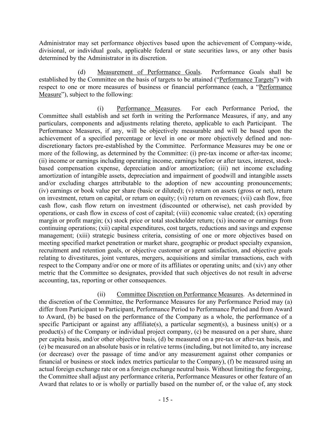 - 15 - Administrator may set performance objectives based upon the achievement of Company-wide, divisional, or individual goals, applicable federal or state securities laws, or any other basis determined by the Administrator in its discretion. (d) Measurement of Performance Goals. Performance Goals shall be established by the Committee on the basis of targets to be attained (“Performance Targets”) with respect to one or more measures of business or financial performance (each, a “Performance Measure”), subject to the following: (i) Performance Measures. For each Performance Period, the Committee shall establish and set forth in writing the Performance Measures, if any, and any particulars, components and adjustments relating thereto, applicable to each Participant. The Performance Measures, if any, will be objectively measurable and will be based upon the achievement of a specified percentage or level in one or more objectively defined and non- discretionary factors pre-established by the Committee. Performance Measures may be one or more of the following, as determined by the Committee: (i) pre-tax income or after-tax income; (ii) income or earnings including operating income, earnings before or after taxes, interest, stock- based compensation expense, depreciation and/or amortization; (iii) net income excluding amortization of intangible assets, depreciation and impairment of goodwill and intangible assets and/or excluding charges attributable to the adoption of new accounting pronouncements; (iv) earnings or book value per share (basic or diluted); (v) return on assets (gross or net), return on investment, return on capital, or return on equity; (vi) return on revenues; (vii) cash flow, free cash flow, cash flow return on investment (discounted or otherwise), net cash provided by operations, or cash flow in excess of cost of capital; (viii) economic value created; (ix) operating margin or profit margin; (x) stock price or total stockholder return; (xi) income or earnings from continuing operations; (xii) capital expenditures, cost targets, reductions and savings and expense management; (xiii) strategic business criteria, consisting of one or more objectives based on meeting specified market penetration or market share, geographic or product specialty expansion, recruitment and retention goals, or objective customer or agent satisfaction, and objective goals relating to divestitures, joint ventures, mergers, acquisitions and similar transactions, each with respect to the Company and/or one or more of its affiliates or operating units; and (xiv) any other metric that the Committee so designates, provided that such objectives do not result in adverse accounting, tax, reporting or other consequences. (ii) Committee Discretion on Performance Measures. As determined in the discretion of the Committee, the Performance Measures for any Performance Period may (a) differ from Participant to Participant, Performance Period to Performance Period and from Award to Award, (b) be based on the performance of the Company as a whole, the performance of a specific Participant or against any affiliate(s), a particular segment(s), a business unit(s) or a product(s) of the Company or individual project company, (c) be measured on a per share, share per capita basis, and/or other objective basis, (d) be measured on a pre-tax or after-tax basis, and (e) be measured on an absolute basis or in relative terms (including, but not limited to, any increase (or decrease) over the passage of time and/or any measurement against other companies or financial or business or stock index metrics particular to the Company), (f) be measured using an actual foreign exchange rate or on a foreign exchange neutral basis. Without limiting the foregoing, the Committee shall adjust any performance criteria, Performance Measures or other feature of an Award that relates to or is wholly or partially based on the number of, or the value of, any stock