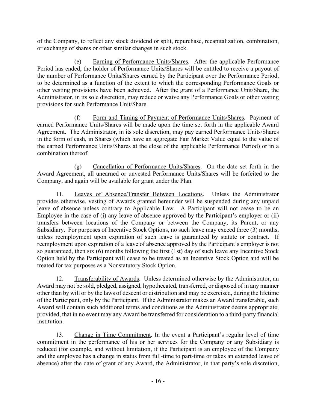 - 16 - of the Company, to reflect any stock dividend or split, repurchase, recapitalization, combination, or exchange of shares or other similar changes in such stock. (e) Earning of Performance Units/Shares. After the applicable Performance Period has ended, the holder of Performance Units/Shares will be entitled to receive a payout of the number of Performance Units/Shares earned by the Participant over the Performance Period, to be determined as a function of the extent to which the corresponding Performance Goals or other vesting provisions have been achieved. After the grant of a Performance Unit/Share, the Administrator, in its sole discretion, may reduce or waive any Performance Goals or other vesting provisions for such Performance Unit/Share. (f) Form and Timing of Payment of Performance Units/Shares. Payment of earned Performance Units/Shares will be made upon the time set forth in the applicable Award Agreement. The Administrator, in its sole discretion, may pay earned Performance Units/Shares in the form of cash, in Shares (which have an aggregate Fair Market Value equal to the value of the earned Performance Units/Shares at the close of the applicable Performance Period) or in a combination thereof. (g) Cancellation of Performance Units/Shares. On the date set forth in the Award Agreement, all unearned or unvested Performance Units/Shares will be forfeited to the Company, and again will be available for grant under the Plan. 11. Leaves of Absence/Transfer Between Locations. Unless the Administrator provides otherwise, vesting of Awards granted hereunder will be suspended during any unpaid leave of absence unless contrary to Applicable Law. A Participant will not cease to be an Employee in the case of (i) any leave of absence approved by the Participant’s employer or (ii) transfers between locations of the Company or between the Company, its Parent, or any Subsidiary. For purposes of Incentive Stock Options, no such leave may exceed three (3) months, unless reemployment upon expiration of such leave is guaranteed by statute or contract. If reemployment upon expiration of a leave of absence approved by the Participant’s employer is not so guaranteed, then six (6) months following the first (1st) day of such leave any Incentive Stock Option held by the Participant will cease to be treated as an Incentive Stock Option and will be treated for tax purposes as a Nonstatutory Stock Option. 12. Transferability of Awards. Unless determined otherwise by the Administrator, an Award may not be sold, pledged, assigned, hypothecated, transferred, or disposed of in any manner other than by will or by the laws of descent or distribution and may be exercised, during the lifetime of the Participant, only by the Participant. If the Administrator makes an Award transferable, such Award will contain such additional terms and conditions as the Administrator deems appropriate; provided, that in no event may any Award be transferred for consideration to a third-party financial institution. 13. Change in Time Commitment. In the event a Participant’s regular level of time commitment in the performance of his or her services for the Company or any Subsidiary is reduced (for example, and without limitation, if the Participant is an employee of the Company and the employee has a change in status from full-time to part-time or takes an extended leave of absence) after the date of grant of any Award, the Administrator, in that party’s sole discretion,
