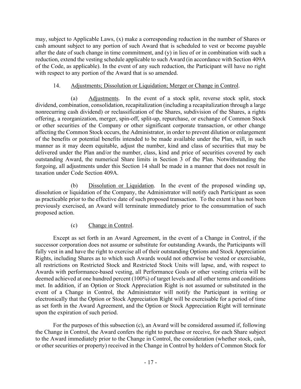 - 17 - may, subject to Applicable Laws, (x) make a corresponding reduction in the number of Shares or cash amount subject to any portion of such Award that is scheduled to vest or become payable after the date of such change in time commitment, and (y) in lieu of or in combination with such a reduction, extend the vesting schedule applicable to such Award (in accordance with Section 409A of the Code, as applicable). In the event of any such reduction, the Participant will have no right with respect to any portion of the Award that is so amended. 14. Adjustments; Dissolution or Liquidation; Merger or Change in Control. (a) Adjustments. In the event of a stock split, reverse stock split, stock dividend, combination, consolidation, recapitalization (including a recapitalization through a large nonrecurring cash dividend) or reclassification of the Shares, subdivision of the Shares, a rights offering, a reorganization, merger, spin-off, split-up, repurchase, or exchange of Common Stock or other securities of the Company or other significant corporate transaction, or other change affecting the Common Stock occurs, the Administrator, in order to prevent dilution or enlargement of the benefits or potential benefits intended to be made available under the Plan, will, in such manner as it may deem equitable, adjust the number, kind and class of securities that may be delivered under the Plan and/or the number, class, kind and price of securities covered by each outstanding Award, the numerical Share limits in Section 3 of the Plan. Notwithstanding the forgoing, all adjustments under this Section 14 shall be made in a manner that does not result in taxation under Code Section 409A. (b) Dissolution or Liquidation. In the event of the proposed winding up, dissolution or liquidation of the Company, the Administrator will notify each Participant as soon as practicable prior to the effective date of such proposed transaction. To the extent it has not been previously exercised, an Award will terminate immediately prior to the consummation of such proposed action. (c) Change in Control. Except as set forth in an Award Agreement, in the event of a Change in Control, if the successor corporation does not assume or substitute for outstanding Awards, the Participants will fully vest in and have the right to exercise all of their outstanding Options and Stock Appreciation Rights, including Shares as to which such Awards would not otherwise be vested or exercisable, all restrictions on Restricted Stock and Restricted Stock Units will lapse, and, with respect to Awards with performance-based vesting, all Performance Goals or other vesting criteria will be deemed achieved at one hundred percent (100%) of target levels and all other terms and conditions met. In addition, if an Option or Stock Appreciation Right is not assumed or substituted in the event of a Change in Control, the Administrator will notify the Participant in writing or electronically that the Option or Stock Appreciation Right will be exercisable for a period of time as set forth in the Award Agreement, and the Option or Stock Appreciation Right will terminate upon the expiration of such period. For the purposes of this subsection (c), an Award will be considered assumed if, following the Change in Control, the Award confers the right to purchase or receive, for each Share subject to the Award immediately prior to the Change in Control, the consideration (whether stock, cash, or other securities or property) received in the Change in Control by holders of Common Stock for