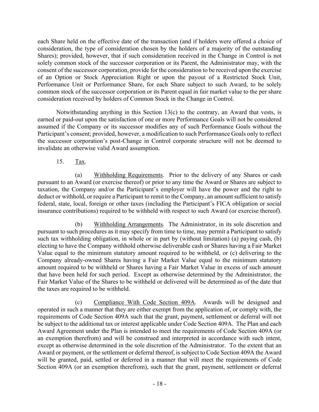 - 18 - each Share held on the effective date of the transaction (and if holders were offered a choice of consideration, the type of consideration chosen by the holders of a majority of the outstanding Shares); provided, however, that if such consideration received in the Change in Control is not solely common stock of the successor corporation or its Parent, the Administrator may, with the consent of the successor corporation, provide for the consideration to be received upon the exercise of an Option or Stock Appreciation Right or upon the payout of a Restricted Stock Unit, Performance Unit or Performance Share, for each Share subject to such Award, to be solely common stock of the successor corporation or its Parent equal in fair market value to the per share consideration received by holders of Common Stock in the Change in Control. Notwithstanding anything in this Section 13(c) to the contrary, an Award that vests, is earned or paid-out upon the satisfaction of one or more Performance Goals will not be considered assumed if the Company or its successor modifies any of such Performance Goals without the Participant’s consent; provided, however, a modification to such Performance Goals only to reflect the successor corporation’s post-Change in Control corporate structure will not be deemed to invalidate an otherwise valid Award assumption. 15. Tax. (a) Withholding Requirements. Prior to the delivery of any Shares or cash pursuant to an Award (or exercise thereof) or prior to any time the Award or Shares are subject to taxation, the Company and/or the Participant’s employer will have the power and the right to deduct or withhold, or require a Participant to remit to the Company, an amount sufficient to satisfy federal, state, local, foreign or other taxes (including the Participant’s FICA obligation or social insurance contributions) required to be withheld with respect to such Award (or exercise thereof). (b) Withholding Arrangements. The Administrator, in its sole discretion and pursuant to such procedures as it may specify from time to time, may permit a Participant to satisfy such tax withholding obligation, in whole or in part by (without limitation) (a) paying cash, (b) electing to have the Company withhold otherwise deliverable cash or Shares having a Fair Market Value equal to the minimum statutory amount required to be withheld, or (c) delivering to the Company already-owned Shares having a Fair Market Value equal to the minimum statutory amount required to be withheld or Shares having a Fair Market Value in excess of such amount that have been held for such period. Except as otherwise determined by the Administrator, the Fair Market Value of the Shares to be withheld or delivered will be determined as of the date that the taxes are required to be withheld. (c) Compliance With Code Section 409A. Awards will be designed and operated in such a manner that they are either exempt from the application of, or comply with, the requirements of Code Section 409A such that the grant, payment, settlement or deferral will not be subject to the additional tax or interest applicable under Code Section 409A. The Plan and each Award Agreement under the Plan is intended to meet the requirements of Code Section 409A (or an exemption therefrom) and will be construed and interpreted in accordance with such intent, except as otherwise determined in the sole discretion of the Administrator. To the extent that an Award or payment, or the settlement or deferral thereof, is subject to Code Section 409A the Award will be granted, paid, settled or deferred in a manner that will meet the requirements of Code Section 409A (or an exemption therefrom), such that the grant, payment, settlement or deferral