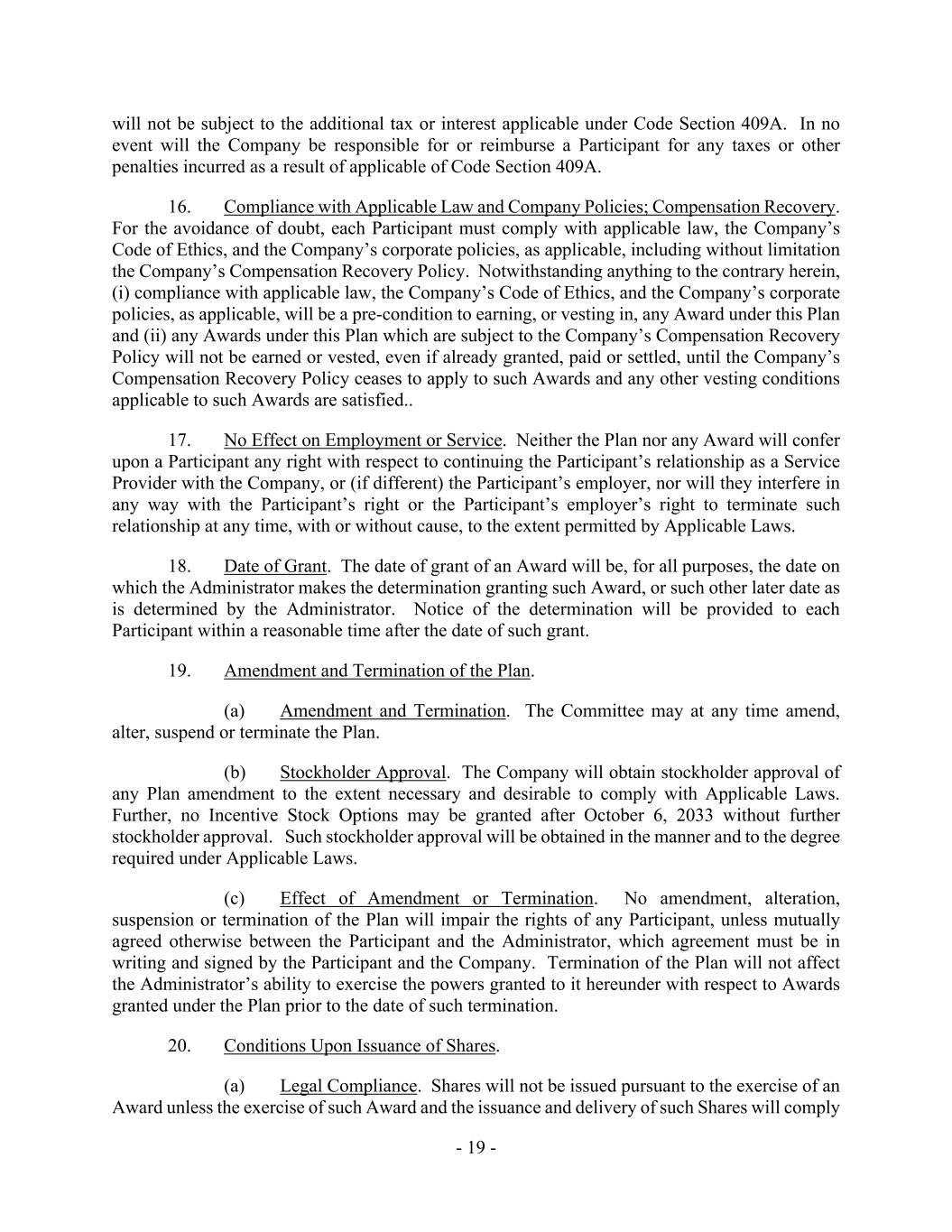 - 19 - will not be subject to the additional tax or interest applicable under Code Section 409A. In no event will the Company be responsible for or reimburse a Participant for any taxes or other penalties incurred as a result of applicable of Code Section 409A. 16. Compliance with Applicable Law and Company Policies; Compensation Recovery. For the avoidance of doubt, each Participant must comply with applicable law, the Company’s Code of Ethics, and the Company’s corporate policies, as applicable, including without limitation the Company’s Compensation Recovery Policy. Notwithstanding anything to the contrary herein, (i) compliance with applicable law, the Company’s Code of Ethics, and the Company’s corporate policies, as applicable, will be a pre-condition to earning, or vesting in, any Award under this Plan and (ii) any Awards under this Plan which are subject to the Company’s Compensation Recovery Policy will not be earned or vested, even if already granted, paid or settled, until the Company’s Compensation Recovery Policy ceases to apply to such Awards and any other vesting conditions applicable to such Awards are satisfied.. 17. No Effect on Employment or Service. Neither the Plan nor any Award will confer upon a Participant any right with respect to continuing the Participant’s relationship as a Service Provider with the Company, or (if different) the Participant’s employer, nor will they interfere in any way with the Participant’s right or the Participant’s employer’s right to terminate such relationship at any time, with or without cause, to the extent permitted by Applicable Laws. 18. Date of Grant. The date of grant of an Award will be, for all purposes, the date on which the Administrator makes the determination granting such Award, or such other later date as is determined by the Administrator. Notice of the determination will be provided to each Participant within a reasonable time after the date of such grant. 19. Amendment and Termination of the Plan. (a) Amendment and Termination. The Committee may at any time amend, alter, suspend or terminate the Plan. (b) Stockholder Approval. The Company will obtain stockholder approval of any Plan amendment to the extent necessary and desirable to comply with Applicable Laws. Further, no Incentive Stock Options may be granted after October 6, 2033 without further stockholder approval. Such stockholder approval will be obtained in the manner and to the degree required under Applicable Laws. (c) Effect of Amendment or Termination. No amendment, alteration, suspension or termination of the Plan will impair the rights of any Participant, unless mutually agreed otherwise between the Participant and the Administrator, which agreement must be in writing and signed by the Participant and the Company. Termination of the Plan will not affect the Administrator’s ability to exercise the powers granted to it hereunder with respect to Awards granted under the Plan prior to the date of such termination. 20. Conditions Upon Issuance of Shares. (a) Legal Compliance. Shares will not be issued pursuant to the exercise of an Award unless the exercise of such Award and the issuance and delivery of such Shares will comply