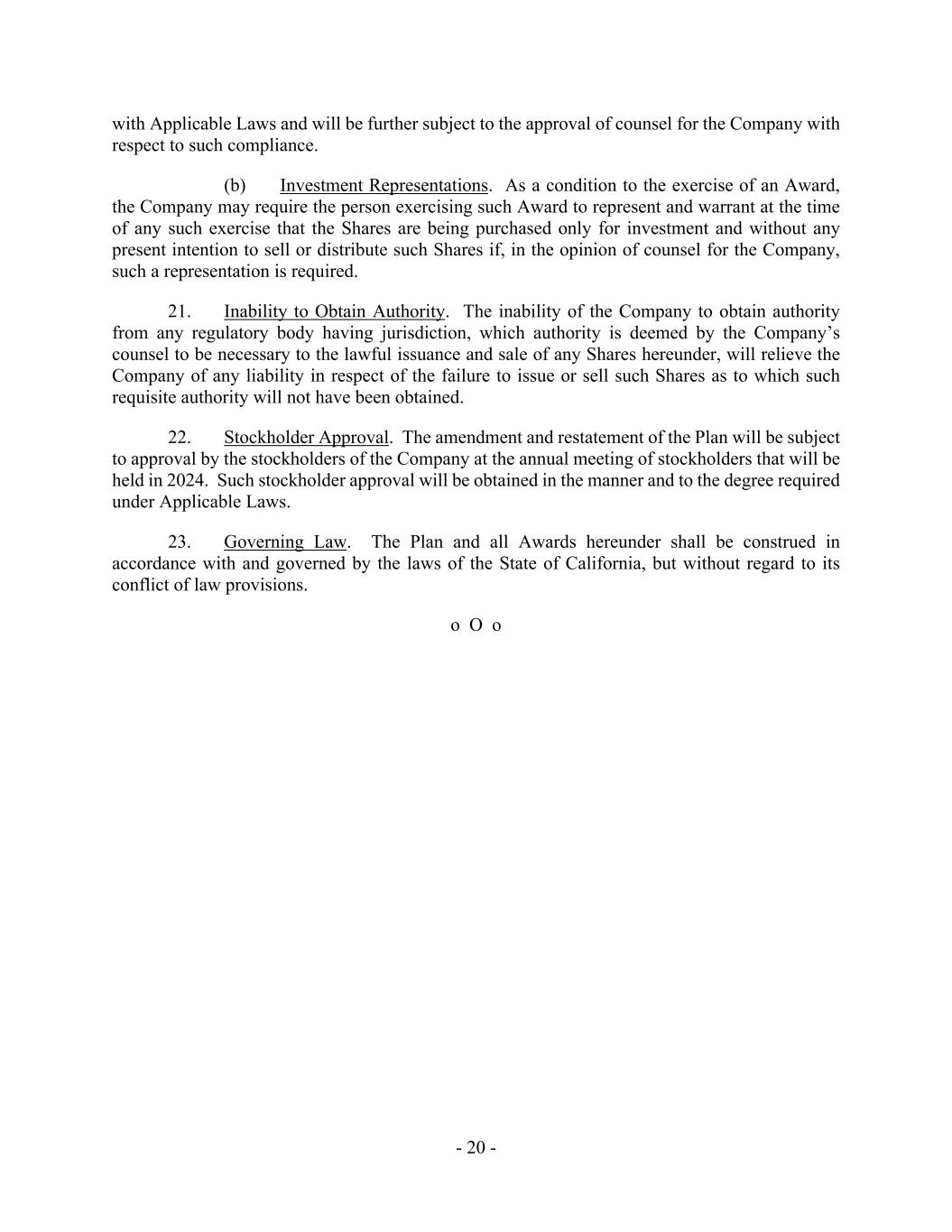 - 20 - with Applicable Laws and will be further subject to the approval of counsel for the Company with respect to such compliance. (b) Investment Representations. As a condition to the exercise of an Award, the Company may require the person exercising such Award to represent and warrant at the time of any such exercise that the Shares are being purchased only for investment and without any present intention to sell or distribute such Shares if, in the opinion of counsel for the Company, such a representation is required. 21. Inability to Obtain Authority. The inability of the Company to obtain authority from any regulatory body having jurisdiction, which authority is deemed by the Company’s counsel to be necessary to the lawful issuance and sale of any Shares hereunder, will relieve the Company of any liability in respect of the failure to issue or sell such Shares as to which such requisite authority will not have been obtained. 22. Stockholder Approval. The amendment and restatement of the Plan will be subject to approval by the stockholders of the Company at the annual meeting of stockholders that will be held in 2024. Such stockholder approval will be obtained in the manner and to the degree required under Applicable Laws. 23. Governing Law. The Plan and all Awards hereunder shall be construed in accordance with and governed by the laws of the State of California, but without regard to its conflict of law provisions. o O o