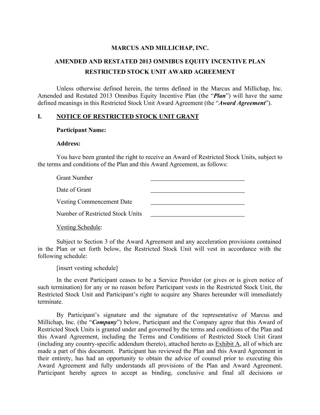 MARCUS AND MILLICHAP, INC. AMENDED AND RESTATED 2013 OMNIBUS EQUITY INCENTIVE PLAN RESTRICTED STOCK UNIT AWARD AGREEMENT Unless otherwise defined herein, the terms defined in the Marcus and Millichap, Inc. Amended and Restated 2013 Omnibus Equity Incentive Plan (the “Plan”) will have the same defined meanings in this Restricted Stock Unit Award Agreement (the “Award Agreement”). I. NOTICE OF RESTRICTED STOCK UNIT GRANT Participant Name: Address: You have been granted the right to receive an Award of Restricted Stock Units, subject to the terms and conditions of the Plan and this Award Agreement, as follows: Grant Number Date of Grant Vesting Commencement Date Number of Restricted Stock Units Vesting Schedule: Subject to Section 3 of the Award Agreement and any acceleration provisions contained in the Plan or set forth below, the Restricted Stock Unit will vest in accordance with the following schedule: [insert vesting schedule] In the event Participant ceases to be a Service Provider (or gives or is given notice of such termination) for any or no reason before Participant vests in the Restricted Stock Unit, the Restricted Stock Unit and Participant’s right to acquire any Shares hereunder will immediately terminate. By Participant’s signature and the signature of the representative of Marcus and Millichap, Inc. (the “Company”) below, Participant and the Company agree that this Award of Restricted Stock Units is granted under and governed by the terms and conditions of the Plan and this Award Agreement, including the Terms and Conditions of Restricted Stock Unit Grant (including any country-specific addendum thereto), attached hereto as Exhibit A, all of which are made a part of this document. Participant has reviewed the Plan and this Award Agreement in their entirety, has had an opportunity to obtain the advice of counsel prior to executing this Award Agreement and fully understands all provisions of the Plan and Award Agreement. Participant hereby agrees to accept as binding, conclusive and final all decisions or
