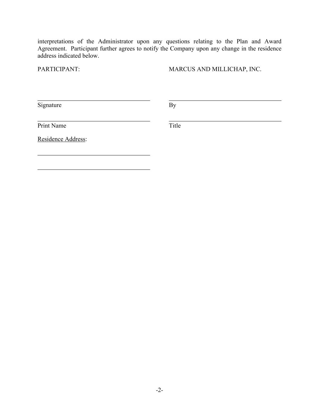 -2- interpretations of the Administrator upon any questions relating to the Plan and Award Agreement. Participant further agrees to notify the Company upon any change in the residence address indicated below. PARTICIPANT: MARCUS AND MILLICHAP, INC. Signature By Print Name Title Residence Address: