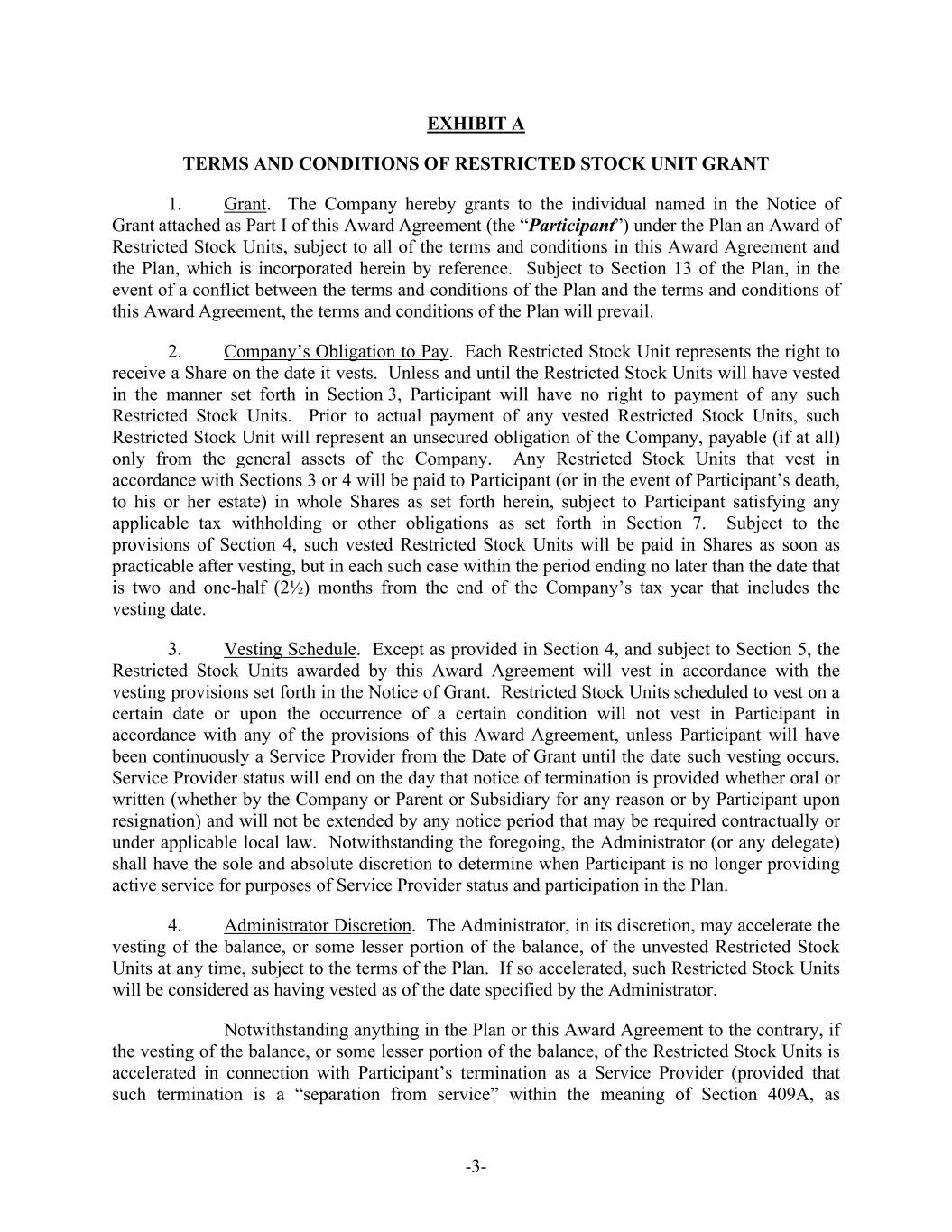 -3- EXHIBIT A TERMS AND CONDITIONS OF RESTRICTED STOCK UNIT GRANT 1. Grant. The Company hereby grants to the individual named in the Notice of Grant attached as Part I of this Award Agreement (the “Participant”) under the Plan an Award of Restricted Stock Units, subject to all of the terms and conditions in this Award Agreement and the Plan, which is incorporated herein by reference. Subject to Section 13 of the Plan, in the event of a conflict between the terms and conditions of the Plan and the terms and conditions of this Award Agreement, the terms and conditions of the Plan will prevail. 2. Company’s Obligation to Pay. Each Restricted Stock Unit represents the right to receive a Share on the date it vests. Unless and until the Restricted Stock Units will have vested in the manner set forth in Section 3, Participant will have no right to payment of any such Restricted Stock Units. Prior to actual payment of any vested Restricted Stock Units, such Restricted Stock Unit will represent an unsecured obligation of the Company, payable (if at all) only from the general assets of the Company. Any Restricted Stock Units that vest in accordance with Sections 3 or 4 will be paid to Participant (or in the event of Participant’s death, to his or her estate) in whole Shares as set forth herein, subject to Participant satisfying any applicable tax withholding or other obligations as set forth in Section 7. Subject to the provisions of Section 4, such vested Restricted Stock Units will be paid in Shares as soon as practicable after vesting, but in each such case within the period ending no later than the date that is two and one-half (2½) months from the end of the Company’s tax year that includes the vesting date. 3. Vesting Schedule. Except as provided in Section 4, and subject to Section 5, the Restricted Stock Units awarded by this Award Agreement will vest in accordance with the vesting provisions set forth in the Notice of Grant. Restricted Stock Units scheduled to vest on a certain date or upon the occurrence of a certain condition will not vest in Participant in accordance with any of the provisions of this Award Agreement, unless Participant will have been continuously a Service Provider from the Date of Grant until the date such vesting occurs. Service Provider status will end on the day that notice of termination is provided whether oral or written (whether by the Company or Parent or Subsidiary for any reason or by Participant upon resignation) and will not be extended by any notice period that may be required contractually or under applicable local law. Notwithstanding the foregoing, the Administrator (or any delegate) shall have the sole and absolute discretion to determine when Participant is no longer providing active service for purposes of Service Provider status and participation in the Plan. 4. Administrator Discretion. The Administrator, in its discretion, may accelerate the vesting of the balance, or some lesser portion of the balance, of the unvested Restricted Stock Units at any time, subject to the terms of the Plan. If so accelerated, such Restricted Stock Units will be considered as having vested as of the date specified by the Administrator. Notwithstanding anything in the Plan or this Award Agreement to the contrary, if the vesting of the balance, or some lesser portion of the balance, of the Restricted Stock Units is accelerated in connection with Participant’s termination as a Service Provider (provided that such termination is a “separation from service” within the meaning of Section 409A, as