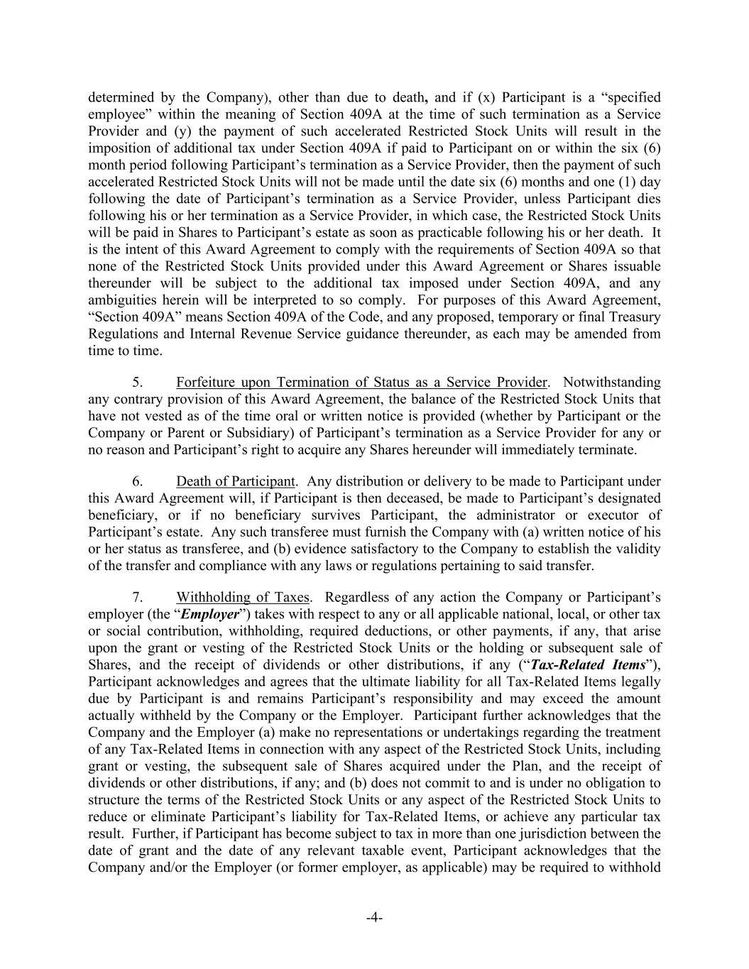 -4- determined by the Company), other than due to death, and if (x) Participant is a “specified employee” within the meaning of Section 409A at the time of such termination as a Service Provider and (y) the payment of such accelerated Restricted Stock Units will result in the imposition of additional tax under Section 409A if paid to Participant on or within the six (6) month period following Participant’s termination as a Service Provider, then the payment of such accelerated Restricted Stock Units will not be made until the date six (6) months and one (1) day following the date of Participant’s termination as a Service Provider, unless Participant dies following his or her termination as a Service Provider, in which case, the Restricted Stock Units will be paid in Shares to Participant’s estate as soon as practicable following his or her death. It is the intent of this Award Agreement to comply with the requirements of Section 409A so that none of the Restricted Stock Units provided under this Award Agreement or Shares issuable thereunder will be subject to the additional tax imposed under Section 409A, and any ambiguities herein will be interpreted to so comply. For purposes of this Award Agreement, “Section 409A” means Section 409A of the Code, and any proposed, temporary or final Treasury Regulations and Internal Revenue Service guidance thereunder, as each may be amended from time to time. 5. Forfeiture upon Termination of Status as a Service Provider. Notwithstanding any contrary provision of this Award Agreement, the balance of the Restricted Stock Units that have not vested as of the time oral or written notice is provided (whether by Participant or the Company or Parent or Subsidiary) of Participant’s termination as a Service Provider for any or no reason and Participant’s right to acquire any Shares hereunder will immediately terminate. 6. Death of Participant. Any distribution or delivery to be made to Participant under this Award Agreement will, if Participant is then deceased, be made to Participant’s designated beneficiary, or if no beneficiary survives Participant, the administrator or executor of Participant’s estate. Any such transferee must furnish the Company with (a) written notice of his or her status as transferee, and (b) evidence satisfactory to the Company to establish the validity of the transfer and compliance with any laws or regulations pertaining to said transfer. 7. Withholding of Taxes. Regardless of any action the Company or Participant’s employer (the “Employer”) takes with respect to any or all applicable national, local, or other tax or social contribution, withholding, required deductions, or other payments, if any, that arise upon the grant or vesting of the Restricted Stock Units or the holding or subsequent sale of Shares, and the receipt of dividends or other distributions, if any (“Tax-Related Items”), Participant acknowledges and agrees that the ultimate liability for all Tax-Related Items legally due by Participant is and remains Participant’s responsibility and may exceed the amount actually withheld by the Company or the Employer. Participant further acknowledges that the Company and the Employer (a) make no representations or undertakings regarding the treatment of any Tax-Related Items in connection with any aspect of the Restricted Stock Units, including grant or vesting, the subsequent sale of Shares acquired under the Plan, and the receipt of dividends or other distributions, if any; and (b) does not commit to and is under no obligation to structure the terms of the Restricted Stock Units or any aspect of the Restricted Stock Units to reduce or eliminate Participant’s liability for Tax-Related Items, or achieve any particular tax result. Further, if Participant has become subject to tax in more than one jurisdiction between the date of grant and the date of any relevant taxable event, Participant acknowledges that the Company and/or the Employer (or former employer, as applicable) may be required to withhold