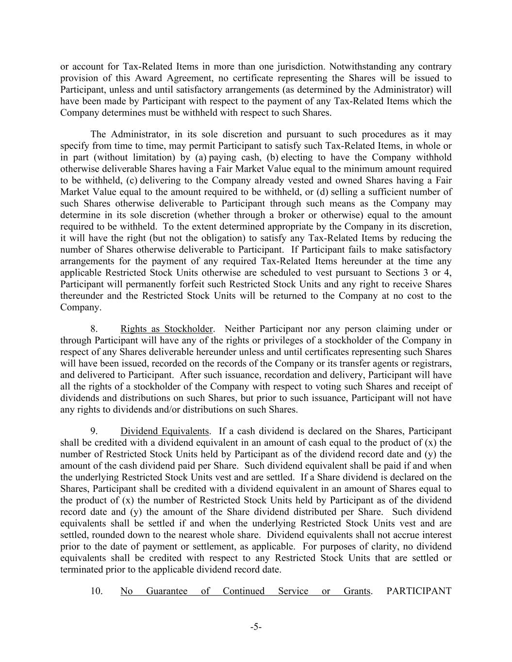 -5- or account for Tax-Related Items in more than one jurisdiction. Notwithstanding any contrary provision of this Award Agreement, no certificate representing the Shares will be issued to Participant, unless and until satisfactory arrangements (as determined by the Administrator) will have been made by Participant with respect to the payment of any Tax-Related Items which the Company determines must be withheld with respect to such Shares. The Administrator, in its sole discretion and pursuant to such procedures as it may specify from time to time, may permit Participant to satisfy such Tax-Related Items, in whole or in part (without limitation) by (a) paying cash, (b) electing to have the Company withhold otherwise deliverable Shares having a Fair Market Value equal to the minimum amount required to be withheld, (c) delivering to the Company already vested and owned Shares having a Fair Market Value equal to the amount required to be withheld, or (d) selling a sufficient number of such Shares otherwise deliverable to Participant through such means as the Company may determine in its sole discretion (whether through a broker or otherwise) equal to the amount required to be withheld. To the extent determined appropriate by the Company in its discretion, it will have the right (but not the obligation) to satisfy any Tax-Related Items by reducing the number of Shares otherwise deliverable to Participant. If Participant fails to make satisfactory arrangements for the payment of any required Tax-Related Items hereunder at the time any applicable Restricted Stock Units otherwise are scheduled to vest pursuant to Sections 3 or 4, Participant will permanently forfeit such Restricted Stock Units and any right to receive Shares thereunder and the Restricted Stock Units will be returned to the Company at no cost to the Company. 8. Rights as Stockholder. Neither Participant nor any person claiming under or through Participant will have any of the rights or privileges of a stockholder of the Company in respect of any Shares deliverable hereunder unless and until certificates representing such Shares will have been issued, recorded on the records of the Company or its transfer agents or registrars, and delivered to Participant. After such issuance, recordation and delivery, Participant will have all the rights of a stockholder of the Company with respect to voting such Shares and receipt of dividends and distributions on such Shares, but prior to such issuance, Participant will not have any rights to dividends and/or distributions on such Shares. 9. Dividend Equivalents. If a cash dividend is declared on the Shares, Participant shall be credited with a dividend equivalent in an amount of cash equal to the product of (x) the number of Restricted Stock Units held by Participant as of the dividend record date and (y) the amount of the cash dividend paid per Share. Such dividend equivalent shall be paid if and when the underlying Restricted Stock Units vest and are settled. If a Share dividend is declared on the Shares, Participant shall be credited with a dividend equivalent in an amount of Shares equal to the product of (x) the number of Restricted Stock Units held by Participant as of the dividend record date and (y) the amount of the Share dividend distributed per Share. Such dividend equivalents shall be settled if and when the underlying Restricted Stock Units vest and are settled, rounded down to the nearest whole share. Dividend equivalents shall not accrue interest prior to the date of payment or settlement, as applicable. For purposes of clarity, no dividend equivalents shall be credited with respect to any Restricted Stock Units that are settled or terminated prior to the applicable dividend record date. 10. No Guarantee of Continued Service or Grants. PARTICIPANT