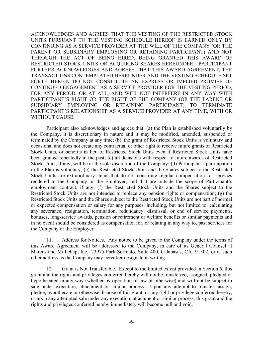-6- ACKNOWLEDGES AND AGREES THAT THE VESTING OF THE RESTRICTED STOCK UNITS PURSUANT TO THE VESTING SCHEDULE HEREOF IS EARNED ONLY BY CONTINUING AS A SERVICE PROVIDER AT THE WILL OF THE COMPANY (OR THE PARENT OR SUBSIDIARY EMPLOYING OR RETAINING PARTICIPANT) AND NOT THROUGH THE ACT OF BEING HIRED, BEING GRANTED THIS AWARD OF RESTRICTED STOCK UNITS OR ACQUIRING SHARES HEREUNDER. PARTICIPANT FURTHER ACKNOWLEDGES AND AGREES THAT THIS AWARD AGREEMENT, THE TRANSACTIONS CONTEMPLATED HEREUNDER AND THE VESTING SCHEDULE SET FORTH HEREIN DO NOT CONSTITUTE AN EXPRESS OR IMPLIED PROMISE OF CONTINUED ENGAGEMENT AS A SERVICE PROVIDER FOR THE VESTING PERIOD, FOR ANY PERIOD, OR AT ALL, AND WILL NOT INTERFERE IN ANY WAY WITH PARTICIPANT’S RIGHT OR THE RIGHT OF THE COMPANY (OR THE PARENT OR SUBSIDIARY EMPLOYING OR RETAINING PARTICIPANT) TO TERMINATE PARTICIPANT’S RELATIONSHIP AS A SERVICE PROVIDER AT ANY TIME, WITH OR WITHOUT CAUSE. Participant also acknowledges and agrees that: (a) the Plan is established voluntarily by the Company, it is discretionary in nature and it may be modified, amended, suspended or terminated by the Company at any time; (b) the grant of Restricted Stock Units is voluntary and occasional and does not create any contractual or other right to receive future grants of Restricted Stock Units, or benefits in lieu of Restricted Stock Units even if Restricted Stock Units have been granted repeatedly in the past; (c) all decisions with respect to future awards of Restricted Stock Units, if any, will be at the sole discretion of the Company; (d) Participant’s participation in the Plan is voluntary; (e) the Restricted Stock Units and the Shares subject to the Restricted Stock Units are extraordinary items that do not constitute regular compensation for services rendered to the Company or the Employer, and that are outside the scope of Participant’s employment contract, if any; (f) the Restricted Stock Units and the Shares subject to the Restricted Stock Units are not intended to replace any pension rights or compensation; (g) the Restricted Stock Units and the Shares subject to the Restricted Stock Units are not part of normal or expected compensation or salary for any purposes, including, but not limited to, calculating any severance, resignation, termination, redundancy, dismissal, or end of service payments, bonuses, long-service awards, pension or retirement or welfare benefits or similar payments and in no event should be considered as compensation for, or relating in any way to, past services for the Company or the Employer. 11. Address for Notices. Any notice to be given to the Company under the terms of this Award Agreement will be addressed to the Company, in care of its General Counsel at Marcus and Millichap, Inc., 23975 Park Sorrento, Suite 400, Calabasas, CA 91302, or at such other address as the Company may hereafter designate in writing. 12. Grant is Not Transferable. Except to the limited extent provided in Section 6, this grant and the rights and privileges conferred hereby will not be transferred, assigned, pledged or hypothecated in any way (whether by operation of law or otherwise) and will not be subject to sale under execution, attachment or similar process. Upon any attempt to transfer, assign, pledge, hypothecate or otherwise dispose of this grant, or any right or privilege conferred hereby, or upon any attempted sale under any execution, attachment or similar process, this grant and the rights and privileges conferred hereby immediately will become null and void.