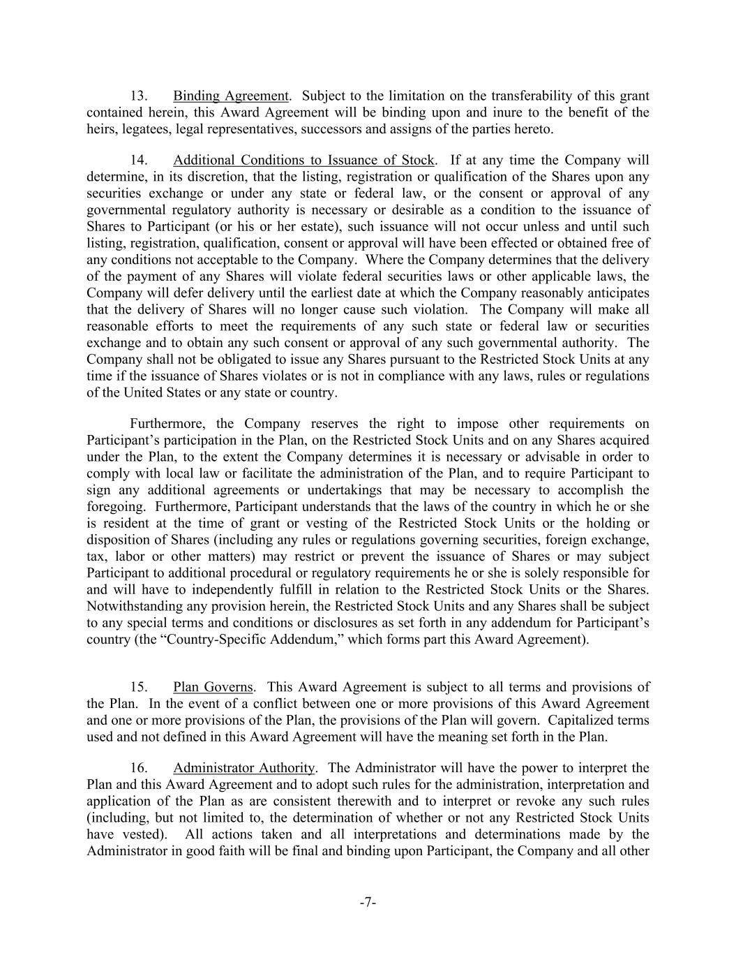 -7- 13. Binding Agreement. Subject to the limitation on the transferability of this grant contained herein, this Award Agreement will be binding upon and inure to the benefit of the heirs, legatees, legal representatives, successors and assigns of the parties hereto. 14. Additional Conditions to Issuance of Stock. If at any time the Company will determine, in its discretion, that the listing, registration or qualification of the Shares upon any securities exchange or under any state or federal law, or the consent or approval of any governmental regulatory authority is necessary or desirable as a condition to the issuance of Shares to Participant (or his or her estate), such issuance will not occur unless and until such listing, registration, qualification, consent or approval will have been effected or obtained free of any conditions not acceptable to the Company. Where the Company determines that the delivery of the payment of any Shares will violate federal securities laws or other applicable laws, the Company will defer delivery until the earliest date at which the Company reasonably anticipates that the delivery of Shares will no longer cause such violation. The Company will make all reasonable efforts to meet the requirements of any such state or federal law or securities exchange and to obtain any such consent or approval of any such governmental authority. The Company shall not be obligated to issue any Shares pursuant to the Restricted Stock Units at any time if the issuance of Shares violates or is not in compliance with any laws, rules or regulations of the United States or any state or country. Furthermore, the Company reserves the right to impose other requirements on Participant’s participation in the Plan, on the Restricted Stock Units and on any Shares acquired under the Plan, to the extent the Company determines it is necessary or advisable in order to comply with local law or facilitate the administration of the Plan, and to require Participant to sign any additional agreements or undertakings that may be necessary to accomplish the foregoing. Furthermore, Participant understands that the laws of the country in which he or she is resident at the time of grant or vesting of the Restricted Stock Units or the holding or disposition of Shares (including any rules or regulations governing securities, foreign exchange, tax, labor or other matters) may restrict or prevent the issuance of Shares or may subject Participant to additional procedural or regulatory requirements he or she is solely responsible for and will have to independently fulfill in relation to the Restricted Stock Units or the Shares. Notwithstanding any provision herein, the Restricted Stock Units and any Shares shall be subject to any special terms and conditions or disclosures as set forth in any addendum for Participant’s country (the “Country-Specific Addendum,” which forms part this Award Agreement). 15. Plan Governs. This Award Agreement is subject to all terms and provisions of the Plan. In the event of a conflict between one or more provisions of this Award Agreement and one or more provisions of the Plan, the provisions of the Plan will govern. Capitalized terms used and not defined in this Award Agreement will have the meaning set forth in the Plan. 16. Administrator Authority. The Administrator will have the power to interpret the Plan and this Award Agreement and to adopt such rules for the administration, interpretation and application of the Plan as are consistent therewith and to interpret or revoke any such rules (including, but not limited to, the determination of whether or not any Restricted Stock Units have vested). All actions taken and all interpretations and determinations made by the Administrator in good faith will be final and binding upon Participant, the Company and all other