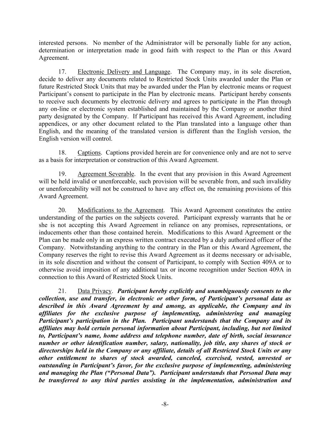 -8- interested persons. No member of the Administrator will be personally liable for any action, determination or interpretation made in good faith with respect to the Plan or this Award Agreement. 17. Electronic Delivery and Language. The Company may, in its sole discretion, decide to deliver any documents related to Restricted Stock Units awarded under the Plan or future Restricted Stock Units that may be awarded under the Plan by electronic means or request Participant’s consent to participate in the Plan by electronic means. Participant hereby consents to receive such documents by electronic delivery and agrees to participate in the Plan through any on-line or electronic system established and maintained by the Company or another third party designated by the Company. If Participant has received this Award Agreement, including appendices, or any other document related to the Plan translated into a language other than English, and the meaning of the translated version is different than the English version, the English version will control. 18. Captions. Captions provided herein are for convenience only and are not to serve as a basis for interpretation or construction of this Award Agreement. 19. Agreement Severable. In the event that any provision in this Award Agreement will be held invalid or unenforceable, such provision will be severable from, and such invalidity or unenforceability will not be construed to have any effect on, the remaining provisions of this Award Agreement. 20. Modifications to the Agreement. This Award Agreement constitutes the entire understanding of the parties on the subjects covered. Participant expressly warrants that he or she is not accepting this Award Agreement in reliance on any promises, representations, or inducements other than those contained herein. Modifications to this Award Agreement or the Plan can be made only in an express written contract executed by a duly authorized officer of the Company. Notwithstanding anything to the contrary in the Plan or this Award Agreement, the Company reserves the right to revise this Award Agreement as it deems necessary or advisable, in its sole discretion and without the consent of Participant, to comply with Section 409A or to otherwise avoid imposition of any additional tax or income recognition under Section 409A in connection to this Award of Restricted Stock Units. 21. Data Privacy. Participant hereby explicitly and unambiguously consents to the collection, use and transfer, in electronic or other form, of Participant’s personal data as described in this Award Agreement by and among, as applicable, the Company and its affiliates for the exclusive purpose of implementing, administering and managing Participant’s participation in the Plan. Participant understands that the Company and its affiliates may hold certain personal information about Participant, including, but not limited to, Participant’s name, home address and telephone number, date of birth, social insurance number or other identification number, salary, nationality, job title, any shares of stock or directorships held in the Company or any affiliate, details of all Restricted Stock Units or any other entitlement to shares of stock awarded, canceled, exercised, vested, unvested or outstanding in Participant’s favor, for the exclusive purpose of implementing, administering and managing the Plan (“Personal Data”). Participant understands that Personal Data may be transferred to any third parties assisting in the implementation, administration and