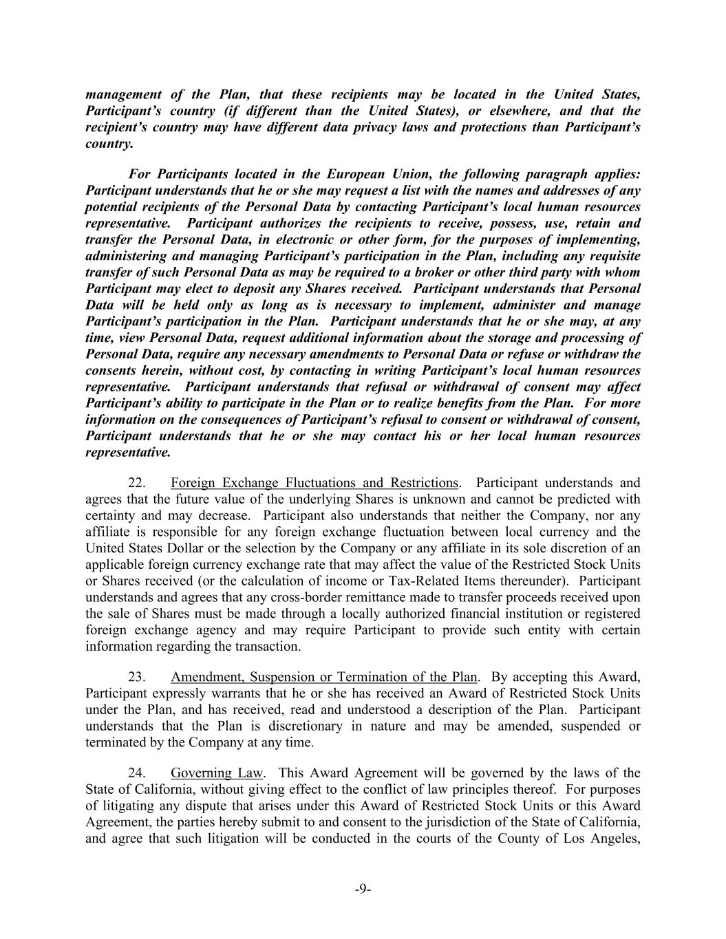 -9- management of the Plan, that these recipients may be located in the United States, Participant’s country (if different than the United States), or elsewhere, and that the recipient’s country may have different data privacy laws and protections than Participant’s country. For Participants located in the European Union, the following paragraph applies: Participant understands that he or she may request a list with the names and addresses of any potential recipients of the Personal Data by contacting Participant’s local human resources representative. Participant authorizes the recipients to receive, possess, use, retain and transfer the Personal Data, in electronic or other form, for the purposes of implementing, administering and managing Participant’s participation in the Plan, including any requisite transfer of such Personal Data as may be required to a broker or other third party with whom Participant may elect to deposit any Shares received. Participant understands that Personal Data will be held only as long as is necessary to implement, administer and manage Participant’s participation in the Plan. Participant understands that he or she may, at any time, view Personal Data, request additional information about the storage and processing of Personal Data, require any necessary amendments to Personal Data or refuse or withdraw the consents herein, without cost, by contacting in writing Participant’s local human resources representative. Participant understands that refusal or withdrawal of consent may affect Participant’s ability to participate in the Plan or to realize benefits from the Plan. For more information on the consequences of Participant’s refusal to consent or withdrawal of consent, Participant understands that he or she may contact his or her local human resources representative. 22. Foreign Exchange Fluctuations and Restrictions. Participant understands and agrees that the future value of the underlying Shares is unknown and cannot be predicted with certainty and may decrease. Participant also understands that neither the Company, nor any affiliate is responsible for any foreign exchange fluctuation between local currency and the United States Dollar or the selection by the Company or any affiliate in its sole discretion of an applicable foreign currency exchange rate that may affect the value of the Restricted Stock Units or Shares received (or the calculation of income or Tax-Related Items thereunder). Participant understands and agrees that any cross-border remittance made to transfer proceeds received upon the sale of Shares must be made through a locally authorized financial institution or registered foreign exchange agency and may require Participant to provide such entity with certain information regarding the transaction. 23. Amendment, Suspension or Termination of the Plan. By accepting this Award, Participant expressly warrants that he or she has received an Award of Restricted Stock Units under the Plan, and has received, read and understood a description of the Plan. Participant understands that the Plan is discretionary in nature and may be amended, suspended or terminated by the Company at any time. 24. Governing Law. This Award Agreement will be governed by the laws of the State of California, without giving effect to the conflict of law principles thereof. For purposes of litigating any dispute that arises under this Award of Restricted Stock Units or this Award Agreement, the parties hereby submit to and consent to the jurisdiction of the State of California, and agree that such litigation will be conducted in the courts of the County of Los Angeles,