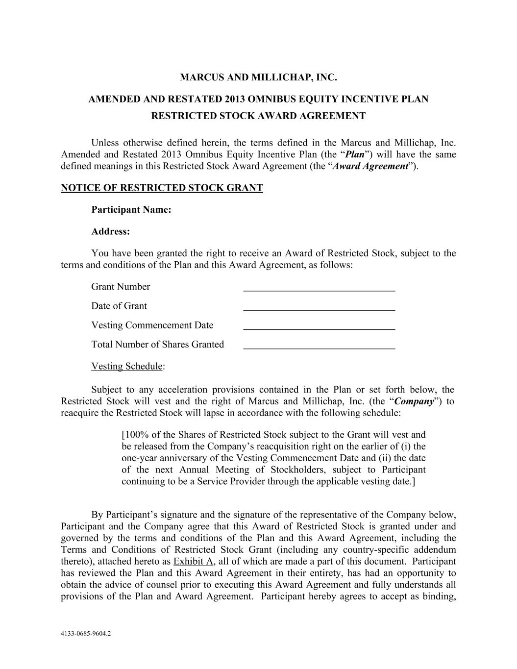 4133-0685-9604.2 MARCUS AND MILLICHAP, INC. AMENDED AND RESTATED 2013 OMNIBUS EQUITY INCENTIVE PLAN RESTRICTED STOCK AWARD AGREEMENT Unless otherwise defined herein, the terms defined in the Marcus and Millichap, Inc. Amended and Restated 2013 Omnibus Equity Incentive Plan (the “Plan”) will have the same defined meanings in this Restricted Stock Award Agreement (the “Award Agreement”). NOTICE OF RESTRICTED STOCK GRANT Participant Name: Address: You have been granted the right to receive an Award of Restricted Stock, subject to the terms and conditions of the Plan and this Award Agreement, as follows: Grant Number Date of Grant Vesting Commencement Date Total Number of Shares Granted Vesting Schedule: Subject to any acceleration provisions contained in the Plan or set forth below, the Restricted Stock will vest and the right of Marcus and Millichap, Inc. (the “Company”) to reacquire the Restricted Stock will lapse in accordance with the following schedule: [100% of the Shares of Restricted Stock subject to the Grant will vest and be released from the Company’s reacquisition right on the earlier of (i) the one-year anniversary of the Vesting Commencement Date and (ii) the date of the next Annual Meeting of Stockholders, subject to Participant continuing to be a Service Provider through the applicable vesting date.] By Participant’s signature and the signature of the representative of the Company below, Participant and the Company agree that this Award of Restricted Stock is granted under and governed by the terms and conditions of the Plan and this Award Agreement, including the Terms and Conditions of Restricted Stock Grant (including any country-specific addendum thereto), attached hereto as Exhibit A, all of which are made a part of this document. Participant has reviewed the Plan and this Award Agreement in their entirety, has had an opportunity to obtain the advice of counsel prior to executing this Award Agreement and fully understands all provisions of the Plan and Award Agreement. Participant hereby agrees to accept as binding,