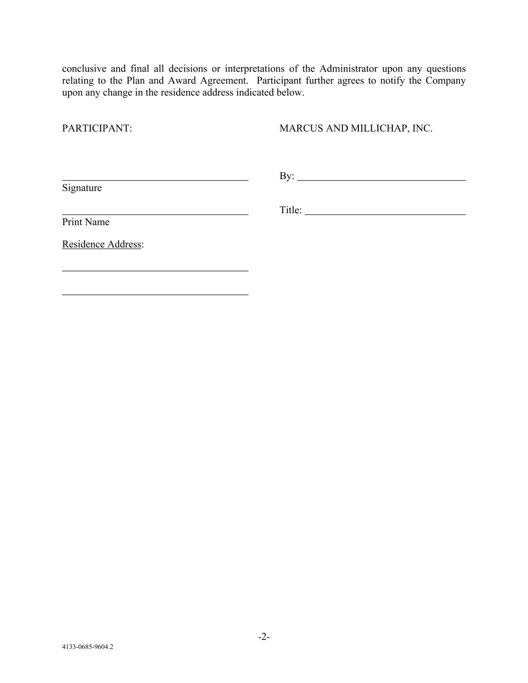 -2- 4133-0685-9604.2 conclusive and final all decisions or interpretations of the Administrator upon any questions relating to the Plan and Award Agreement. Participant further agrees to notify the Company upon any change in the residence address indicated below. PARTICIPANT: MARCUS AND MILLICHAP, INC. By: Signature Title: Print Name Residence Address: