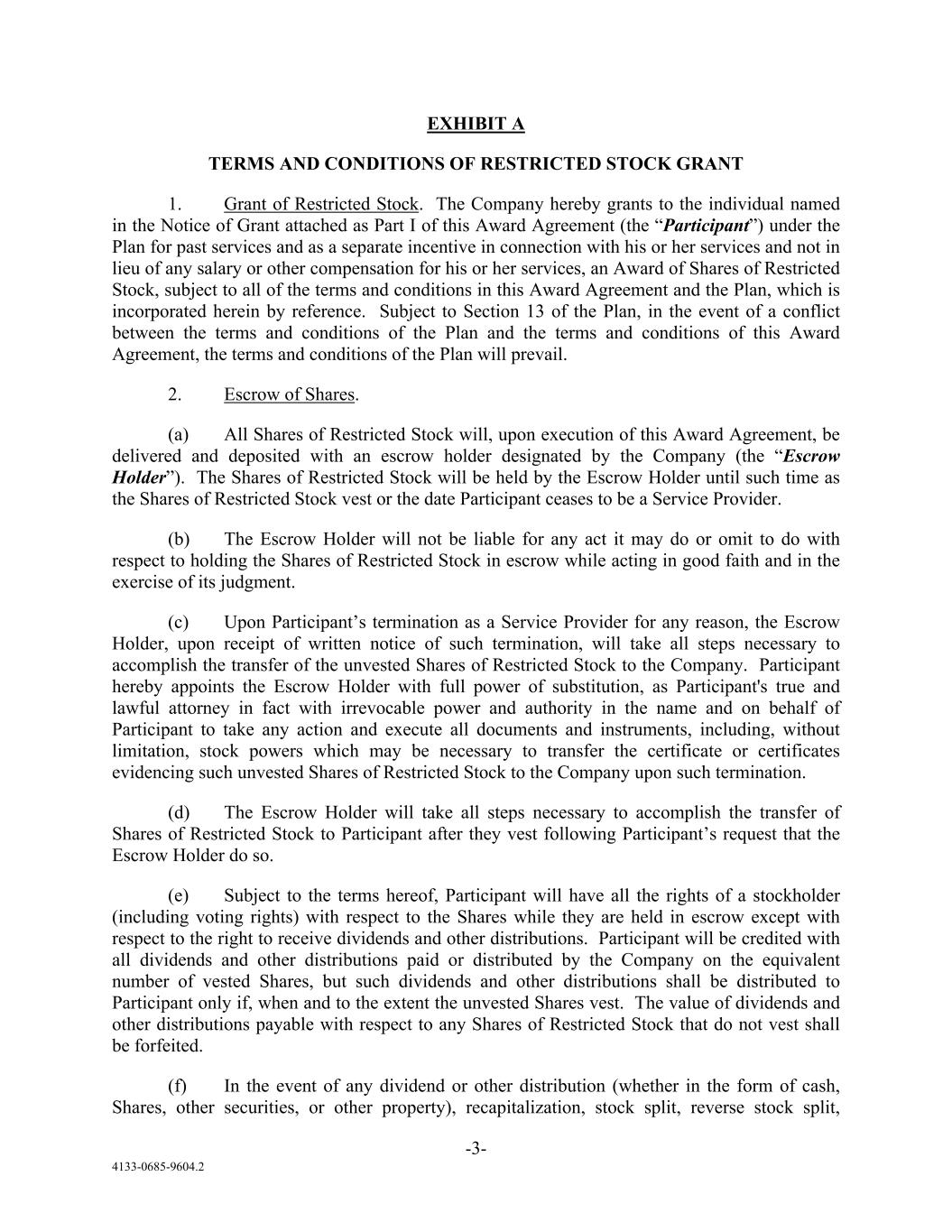 -3- 4133-0685-9604.2 EXHIBIT A TERMS AND CONDITIONS OF RESTRICTED STOCK GRANT 1. Grant of Restricted Stock. The Company hereby grants to the individual named in the Notice of Grant attached as Part I of this Award Agreement (the “Participant”) under the Plan for past services and as a separate incentive in connection with his or her services and not in lieu of any salary or other compensation for his or her services, an Award of Shares of Restricted Stock, subject to all of the terms and conditions in this Award Agreement and the Plan, which is incorporated herein by reference. Subject to Section 13 of the Plan, in the event of a conflict between the terms and conditions of the Plan and the terms and conditions of this Award Agreement, the terms and conditions of the Plan will prevail. 2. Escrow of Shares. (a) All Shares of Restricted Stock will, upon execution of this Award Agreement, be delivered and deposited with an escrow holder designated by the Company (the “Escrow Holder”). The Shares of Restricted Stock will be held by the Escrow Holder until such time as the Shares of Restricted Stock vest or the date Participant ceases to be a Service Provider. (b) The Escrow Holder will not be liable for any act it may do or omit to do with respect to holding the Shares of Restricted Stock in escrow while acting in good faith and in the exercise of its judgment. (c) Upon Participant’s termination as a Service Provider for any reason, the Escrow Holder, upon receipt of written notice of such termination, will take all steps necessary to accomplish the transfer of the unvested Shares of Restricted Stock to the Company. Participant hereby appoints the Escrow Holder with full power of substitution, as Participant's true and lawful attorney in fact with irrevocable power and authority in the name and on behalf of Participant to take any action and execute all documents and instruments, including, without limitation, stock powers which may be necessary to transfer the certificate or certificates evidencing such unvested Shares of Restricted Stock to the Company upon such termination. (d) The Escrow Holder will take all steps necessary to accomplish the transfer of Shares of Restricted Stock to Participant after they vest following Participant’s request that the Escrow Holder do so. (e) Subject to the terms hereof, Participant will have all the rights of a stockholder (including voting rights) with respect to the Shares while they are held in escrow except with respect to the right to receive dividends and other distributions. Participant will be credited with all dividends and other distributions paid or distributed by the Company on the equivalent number of vested Shares, but such dividends and other distributions shall be distributed to Participant only if, when and to the extent the unvested Shares vest. The value of dividends and other distributions payable with respect to any Shares of Restricted Stock that do not vest shall be forfeited. (f) In the event of any dividend or other distribution (whether in the form of cash, Shares, other securities, or other property), recapitalization, stock split, reverse stock split,