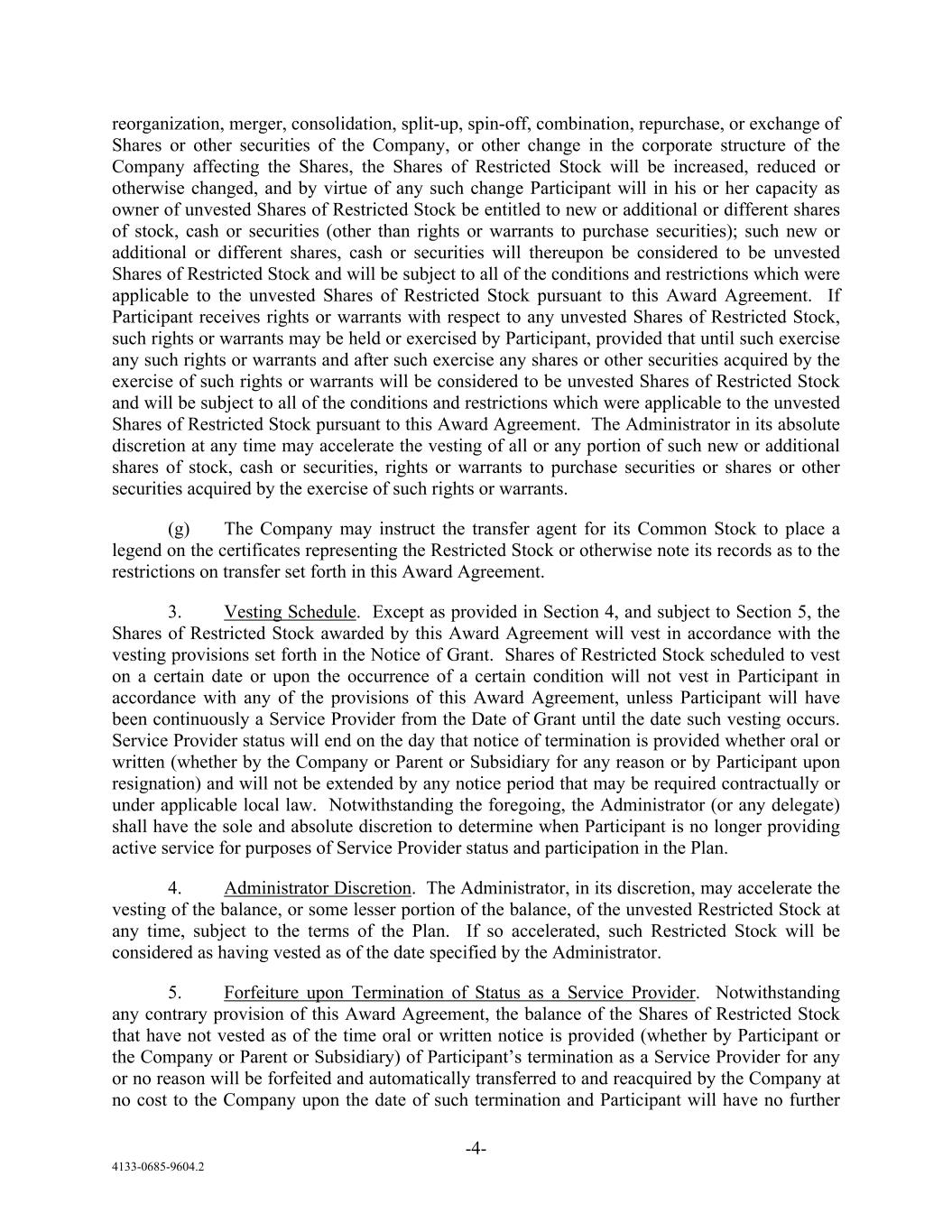 -4- 4133-0685-9604.2 reorganization, merger, consolidation, split-up, spin-off, combination, repurchase, or exchange of Shares or other securities of the Company, or other change in the corporate structure of the Company affecting the Shares, the Shares of Restricted Stock will be increased, reduced or otherwise changed, and by virtue of any such change Participant will in his or her capacity as owner of unvested Shares of Restricted Stock be entitled to new or additional or different shares of stock, cash or securities (other than rights or warrants to purchase securities); such new or additional or different shares, cash or securities will thereupon be considered to be unvested Shares of Restricted Stock and will be subject to all of the conditions and restrictions which were applicable to the unvested Shares of Restricted Stock pursuant to this Award Agreement. If Participant receives rights or warrants with respect to any unvested Shares of Restricted Stock, such rights or warrants may be held or exercised by Participant, provided that until such exercise any such rights or warrants and after such exercise any shares or other securities acquired by the exercise of such rights or warrants will be considered to be unvested Shares of Restricted Stock and will be subject to all of the conditions and restrictions which were applicable to the unvested Shares of Restricted Stock pursuant to this Award Agreement. The Administrator in its absolute discretion at any time may accelerate the vesting of all or any portion of such new or additional shares of stock, cash or securities, rights or warrants to purchase securities or shares or other securities acquired by the exercise of such rights or warrants. (g) The Company may instruct the transfer agent for its Common Stock to place a legend on the certificates representing the Restricted Stock or otherwise note its records as to the restrictions on transfer set forth in this Award Agreement. 3. Vesting Schedule. Except as provided in Section 4, and subject to Section 5, the Shares of Restricted Stock awarded by this Award Agreement will vest in accordance with the vesting provisions set forth in the Notice of Grant. Shares of Restricted Stock scheduled to vest on a certain date or upon the occurrence of a certain condition will not vest in Participant in accordance with any of the provisions of this Award Agreement, unless Participant will have been continuously a Service Provider from the Date of Grant until the date such vesting occurs. Service Provider status will end on the day that notice of termination is provided whether oral or written (whether by the Company or Parent or Subsidiary for any reason or by Participant upon resignation) and will not be extended by any notice period that may be required contractually or under applicable local law. Notwithstanding the foregoing, the Administrator (or any delegate) shall have the sole and absolute discretion to determine when Participant is no longer providing active service for purposes of Service Provider status and participation in the Plan. 4. Administrator Discretion. The Administrator, in its discretion, may accelerate the vesting of the balance, or some lesser portion of the balance, of the unvested Restricted Stock at any time, subject to the terms of the Plan. If so accelerated, such Restricted Stock will be considered as having vested as of the date specified by the Administrator. 5. Forfeiture upon Termination of Status as a Service Provider. Notwithstanding any contrary provision of this Award Agreement, the balance of the Shares of Restricted Stock that have not vested as of the time oral or written notice is provided (whether by Participant or the Company or Parent or Subsidiary) of Participant’s termination as a Service Provider for any or no reason will be forfeited and automatically transferred to and reacquired by the Company at no cost to the Company upon the date of such termination and Participant will have no further