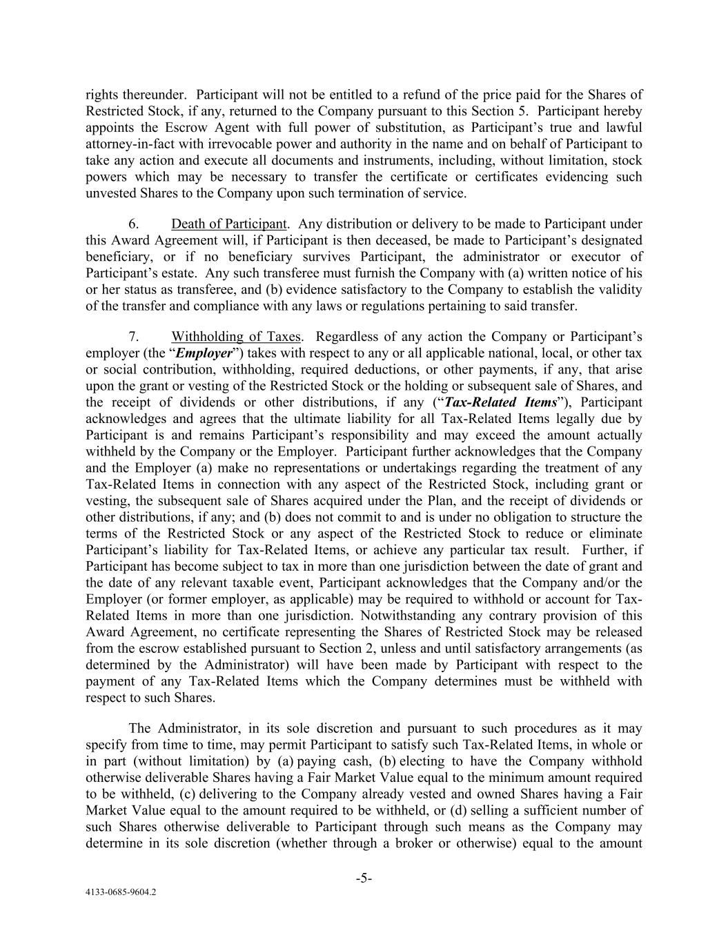 -5- 4133-0685-9604.2 rights thereunder. Participant will not be entitled to a refund of the price paid for the Shares of Restricted Stock, if any, returned to the Company pursuant to this Section 5. Participant hereby appoints the Escrow Agent with full power of substitution, as Participant’s true and lawful attorney-in-fact with irrevocable power and authority in the name and on behalf of Participant to take any action and execute all documents and instruments, including, without limitation, stock powers which may be necessary to transfer the certificate or certificates evidencing such unvested Shares to the Company upon such termination of service. 6. Death of Participant. Any distribution or delivery to be made to Participant under this Award Agreement will, if Participant is then deceased, be made to Participant’s designated beneficiary, or if no beneficiary survives Participant, the administrator or executor of Participant’s estate. Any such transferee must furnish the Company with (a) written notice of his or her status as transferee, and (b) evidence satisfactory to the Company to establish the validity of the transfer and compliance with any laws or regulations pertaining to said transfer. 7. Withholding of Taxes. Regardless of any action the Company or Participant’s employer (the “Employer”) takes with respect to any or all applicable national, local, or other tax or social contribution, withholding, required deductions, or other payments, if any, that arise upon the grant or vesting of the Restricted Stock or the holding or subsequent sale of Shares, and the receipt of dividends or other distributions, if any (“Tax-Related Items”), Participant acknowledges and agrees that the ultimate liability for all Tax-Related Items legally due by Participant is and remains Participant’s responsibility and may exceed the amount actually withheld by the Company or the Employer. Participant further acknowledges that the Company and the Employer (a) make no representations or undertakings regarding the treatment of any Tax-Related Items in connection with any aspect of the Restricted Stock, including grant or vesting, the subsequent sale of Shares acquired under the Plan, and the receipt of dividends or other distributions, if any; and (b) does not commit to and is under no obligation to structure the terms of the Restricted Stock or any aspect of the Restricted Stock to reduce or eliminate Participant’s liability for Tax-Related Items, or achieve any particular tax result. Further, if Participant has become subject to tax in more than one jurisdiction between the date of grant and the date of any relevant taxable event, Participant acknowledges that the Company and/or the Employer (or former employer, as applicable) may be required to withhold or account for Tax- Related Items in more than one jurisdiction. Notwithstanding any contrary provision of this Award Agreement, no certificate representing the Shares of Restricted Stock may be released from the escrow established pursuant to Section 2, unless and until satisfactory arrangements (as determined by the Administrator) will have been made by Participant with respect to the payment of any Tax-Related Items which the Company determines must be withheld with respect to such Shares. The Administrator, in its sole discretion and pursuant to such procedures as it may specify from time to time, may permit Participant to satisfy such Tax-Related Items, in whole or in part (without limitation) by (a) paying cash, (b) electing to have the Company withhold otherwise deliverable Shares having a Fair Market Value equal to the minimum amount required to be withheld, (c) delivering to the Company already vested and owned Shares having a Fair Market Value equal to the amount required to be withheld, or (d) selling a sufficient number of such Shares otherwise deliverable to Participant through such means as the Company may determine in its sole discretion (whether through a broker or otherwise) equal to the amount