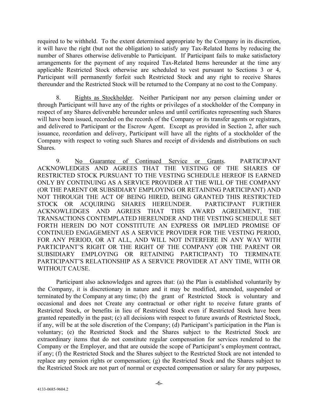 -6- 4133-0685-9604.2 required to be withheld. To the extent determined appropriate by the Company in its discretion, it will have the right (but not the obligation) to satisfy any Tax-Related Items by reducing the number of Shares otherwise deliverable to Participant. If Participant fails to make satisfactory arrangements for the payment of any required Tax-Related Items hereunder at the time any applicable Restricted Stock otherwise are scheduled to vest pursuant to Sections 3 or 4, Participant will permanently forfeit such Restricted Stock and any right to receive Shares thereunder and the Restricted Stock will be returned to the Company at no cost to the Company. 8. Rights as Stockholder. Neither Participant nor any person claiming under or through Participant will have any of the rights or privileges of a stockholder of the Company in respect of any Shares deliverable hereunder unless and until certificates representing such Shares will have been issued, recorded on the records of the Company or its transfer agents or registrars, and delivered to Participant or the Escrow Agent. Except as provided in Section 2, after such issuance, recordation and delivery, Participant will have all the rights of a stockholder of the Company with respect to voting such Shares and receipt of dividends and distributions on such Shares. 9. No Guarantee of Continued Service or Grants. PARTICIPANT ACKNOWLEDGES AND AGREES THAT THE VESTING OF THE SHARES OF RESTRICTED STOCK PURSUANT TO THE VESTING SCHEDULE HEREOF IS EARNED ONLY BY CONTINUING AS A SERVICE PROVIDER AT THE WILL OF THE COMPANY (OR THE PARENT OR SUBSIDIARY EMPLOYING OR RETAINING PARTICIPANT) AND NOT THROUGH THE ACT OF BEING HIRED, BEING GRANTED THIS RESTRICTED STOCK OR ACQUIRING SHARES HEREUNDER. PARTICIPANT FURTHER ACKNOWLEDGES AND AGREES THAT THIS AWARD AGREEMENT, THE TRANSACTIONS CONTEMPLATED HEREUNDER AND THE VESTING SCHEDULE SET FORTH HEREIN DO NOT CONSTITUTE AN EXPRESS OR IMPLIED PROMISE OF CONTINUED ENGAGEMENT AS A SERVICE PROVIDER FOR THE VESTING PERIOD, FOR ANY PERIOD, OR AT ALL, AND WILL NOT INTERFERE IN ANY WAY WITH PARTICIPANT’S RIGHT OR THE RIGHT OF THE COMPANY (OR THE PARENT OR SUBSIDIARY EMPLOYING OR RETAINING PARTICIPANT) TO TERMINATE PARTICIPANT’S RELATIONSHIP AS A SERVICE PROVIDER AT ANY TIME, WITH OR WITHOUT CAUSE. Participant also acknowledges and agrees that: (a) the Plan is established voluntarily by the Company, it is discretionary in nature and it may be modified, amended, suspended or terminated by the Company at any time; (b) the grant of Restricted Stock is voluntary and occasional and does not Create any contractual or other right to receive future grants of Restricted Stock, or benefits in lieu of Restricted Stock even if Restricted Stock have been granted repeatedly in the past; (c) all decisions with respect to future awards of Restricted Stock, if any, will be at the sole discretion of the Company; (d) Participant’s participation in the Plan is voluntary; (e) the Restricted Stock and the Shares subject to the Restricted Stock are extraordinary items that do not constitute regular compensation for services rendered to the Company or the Employer, and that are outside the scope of Participant’s employment contract, if any; (f) the Restricted Stock and the Shares subject to the Restricted Stock are not intended to replace any pension rights or compensation; (g) the Restricted Stock and the Shares subject to the Restricted Stock are not part of normal or expected compensation or salary for any purposes,