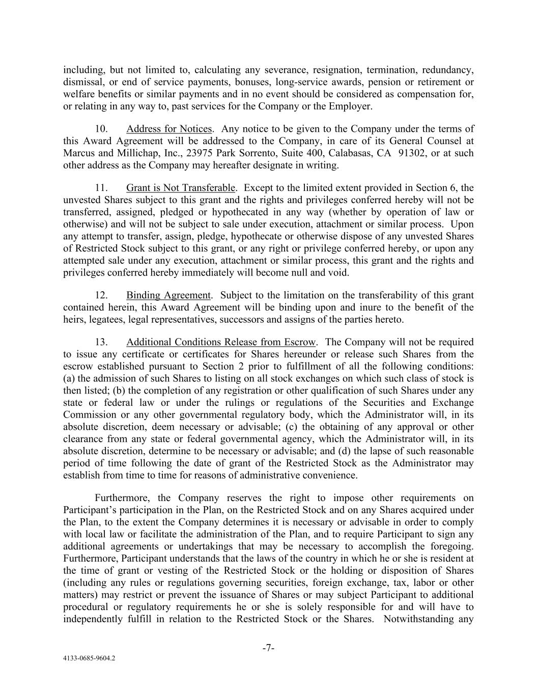 -7- 4133-0685-9604.2 including, but not limited to, calculating any severance, resignation, termination, redundancy, dismissal, or end of service payments, bonuses, long-service awards, pension or retirement or welfare benefits or similar payments and in no event should be considered as compensation for, or relating in any way to, past services for the Company or the Employer. 10. Address for Notices. Any notice to be given to the Company under the terms of this Award Agreement will be addressed to the Company, in care of its General Counsel at Marcus and Millichap, Inc., 23975 Park Sorrento, Suite 400, Calabasas, CA 91302, or at such other address as the Company may hereafter designate in writing. 11. Grant is Not Transferable. Except to the limited extent provided in Section 6, the unvested Shares subject to this grant and the rights and privileges conferred hereby will not be transferred, assigned, pledged or hypothecated in any way (whether by operation of law or otherwise) and will not be subject to sale under execution, attachment or similar process. Upon any attempt to transfer, assign, pledge, hypothecate or otherwise dispose of any unvested Shares of Restricted Stock subject to this grant, or any right or privilege conferred hereby, or upon any attempted sale under any execution, attachment or similar process, this grant and the rights and privileges conferred hereby immediately will become null and void. 12. Binding Agreement. Subject to the limitation on the transferability of this grant contained herein, this Award Agreement will be binding upon and inure to the benefit of the heirs, legatees, legal representatives, successors and assigns of the parties hereto. 13. Additional Conditions Release from Escrow. The Company will not be required to issue any certificate or certificates for Shares hereunder or release such Shares from the escrow established pursuant to Section 2 prior to fulfillment of all the following conditions: (a) the admission of such Shares to listing on all stock exchanges on which such class of stock is then listed; (b) the completion of any registration or other qualification of such Shares under any state or federal law or under the rulings or regulations of the Securities and Exchange Commission or any other governmental regulatory body, which the Administrator will, in its absolute discretion, deem necessary or advisable; (c) the obtaining of any approval or other clearance from any state or federal governmental agency, which the Administrator will, in its absolute discretion, determine to be necessary or advisable; and (d) the lapse of such reasonable period of time following the date of grant of the Restricted Stock as the Administrator may establish from time to time for reasons of administrative convenience. Furthermore, the Company reserves the right to impose other requirements on Participant’s participation in the Plan, on the Restricted Stock and on any Shares acquired under the Plan, to the extent the Company determines it is necessary or advisable in order to comply with local law or facilitate the administration of the Plan, and to require Participant to sign any additional agreements or undertakings that may be necessary to accomplish the foregoing. Furthermore, Participant understands that the laws of the country in which he or she is resident at the time of grant or vesting of the Restricted Stock or the holding or disposition of Shares (including any rules or regulations governing securities, foreign exchange, tax, labor or other matters) may restrict or prevent the issuance of Shares or may subject Participant to additional procedural or regulatory requirements he or she is solely responsible for and will have to independently fulfill in relation to the Restricted Stock or the Shares. Notwithstanding any