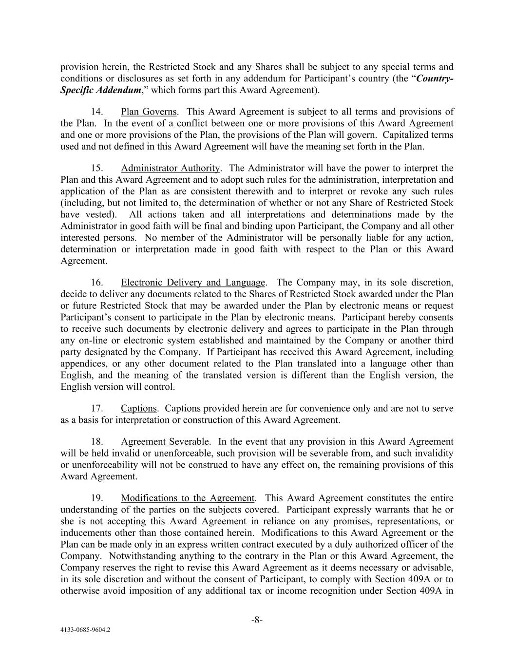 -8- 4133-0685-9604.2 provision herein, the Restricted Stock and any Shares shall be subject to any special terms and conditions or disclosures as set forth in any addendum for Participant’s country (the “Country- Specific Addendum,” which forms part this Award Agreement). 14. Plan Governs. This Award Agreement is subject to all terms and provisions of the Plan. In the event of a conflict between one or more provisions of this Award Agreement and one or more provisions of the Plan, the provisions of the Plan will govern. Capitalized terms used and not defined in this Award Agreement will have the meaning set forth in the Plan. 15. Administrator Authority. The Administrator will have the power to interpret the Plan and this Award Agreement and to adopt such rules for the administration, interpretation and application of the Plan as are consistent therewith and to interpret or revoke any such rules (including, but not limited to, the determination of whether or not any Share of Restricted Stock have vested). All actions taken and all interpretations and determinations made by the Administrator in good faith will be final and binding upon Participant, the Company and all other interested persons. No member of the Administrator will be personally liable for any action, determination or interpretation made in good faith with respect to the Plan or this Award Agreement. 16. Electronic Delivery and Language. The Company may, in its sole discretion, decide to deliver any documents related to the Shares of Restricted Stock awarded under the Plan or future Restricted Stock that may be awarded under the Plan by electronic means or request Participant’s consent to participate in the Plan by electronic means. Participant hereby consents to receive such documents by electronic delivery and agrees to participate in the Plan through any on-line or electronic system established and maintained by the Company or another third party designated by the Company. If Participant has received this Award Agreement, including appendices, or any other document related to the Plan translated into a language other than English, and the meaning of the translated version is different than the English version, the English version will control. 17. Captions. Captions provided herein are for convenience only and are not to serve as a basis for interpretation or construction of this Award Agreement. 18. Agreement Severable. In the event that any provision in this Award Agreement will be held invalid or unenforceable, such provision will be severable from, and such invalidity or unenforceability will not be construed to have any effect on, the remaining provisions of this Award Agreement. 19. Modifications to the Agreement. This Award Agreement constitutes the entire understanding of the parties on the subjects covered. Participant expressly warrants that he or she is not accepting this Award Agreement in reliance on any promises, representations, or inducements other than those contained herein. Modifications to this Award Agreement or the Plan can be made only in an express written contract executed by a duly authorized officer of the Company. Notwithstanding anything to the contrary in the Plan or this Award Agreement, the Company reserves the right to revise this Award Agreement as it deems necessary or advisable, in its sole discretion and without the consent of Participant, to comply with Section 409A or to otherwise avoid imposition of any additional tax or income recognition under Section 409A in
