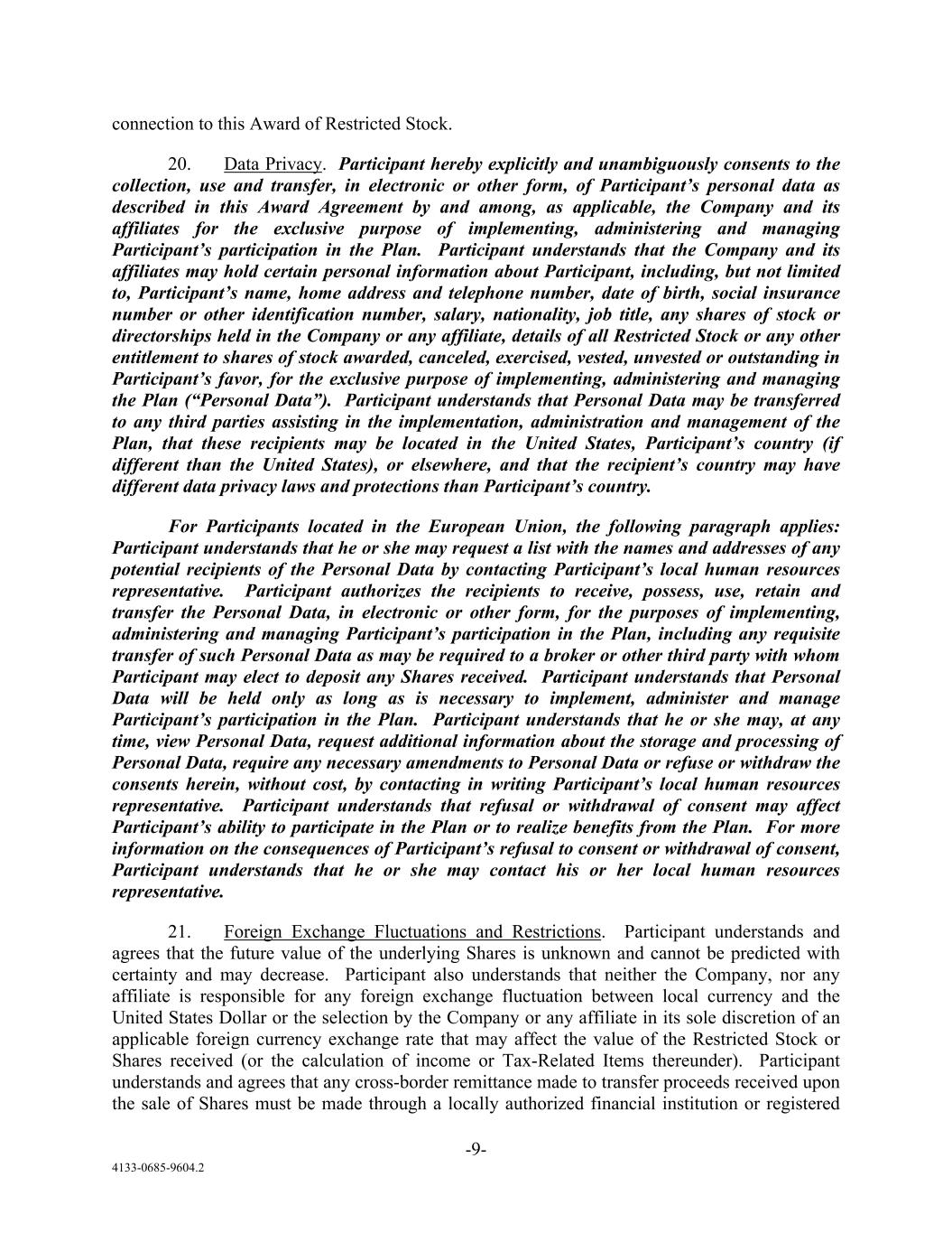 -9- 4133-0685-9604.2 connection to this Award of Restricted Stock. 20. Data Privacy. Participant hereby explicitly and unambiguously consents to the collection, use and transfer, in electronic or other form, of Participant’s personal data as described in this Award Agreement by and among, as applicable, the Company and its affiliates for the exclusive purpose of implementing, administering and managing Participant’s participation in the Plan. Participant understands that the Company and its affiliates may hold certain personal information about Participant, including, but not limited to, Participant’s name, home address and telephone number, date of birth, social insurance number or other identification number, salary, nationality, job title, any shares of stock or directorships held in the Company or any affiliate, details of all Restricted Stock or any other entitlement to shares of stock awarded, canceled, exercised, vested, unvested or outstanding in Participant’s favor, for the exclusive purpose of implementing, administering and managing the Plan (“Personal Data”). Participant understands that Personal Data may be transferred to any third parties assisting in the implementation, administration and management of the Plan, that these recipients may be located in the United States, Participant’s country (if different than the United States), or elsewhere, and that the recipient’s country may have different data privacy laws and protections than Participant’s country. For Participants located in the European Union, the following paragraph applies: Participant understands that he or she may request a list with the names and addresses of any potential recipients of the Personal Data by contacting Participant’s local human resources representative. Participant authorizes the recipients to receive, possess, use, retain and transfer the Personal Data, in electronic or other form, for the purposes of implementing, administering and managing Participant’s participation in the Plan, including any requisite transfer of such Personal Data as may be required to a broker or other third party with whom Participant may elect to deposit any Shares received. Participant understands that Personal Data will be held only as long as is necessary to implement, administer and manage Participant’s participation in the Plan. Participant understands that he or she may, at any time, view Personal Data, request additional information about the storage and processing of Personal Data, require any necessary amendments to Personal Data or refuse or withdraw the consents herein, without cost, by contacting in writing Participant’s local human resources representative. Participant understands that refusal or withdrawal of consent may affect Participant’s ability to participate in the Plan or to realize benefits from the Plan. For more information on the consequences of Participant’s refusal to consent or withdrawal of consent, Participant understands that he or she may contact his or her local human resources representative. 21. Foreign Exchange Fluctuations and Restrictions. Participant understands and agrees that the future value of the underlying Shares is unknown and cannot be predicted with certainty and may decrease. Participant also understands that neither the Company, nor any affiliate is responsible for any foreign exchange fluctuation between local currency and the United States Dollar or the selection by the Company or any affiliate in its sole discretion of an applicable foreign currency exchange rate that may affect the value of the Restricted Stock or Shares received (or the calculation of income or Tax-Related Items thereunder). Participant understands and agrees that any cross-border remittance made to transfer proceeds received upon the sale of Shares must be made through a locally authorized financial institution or registered