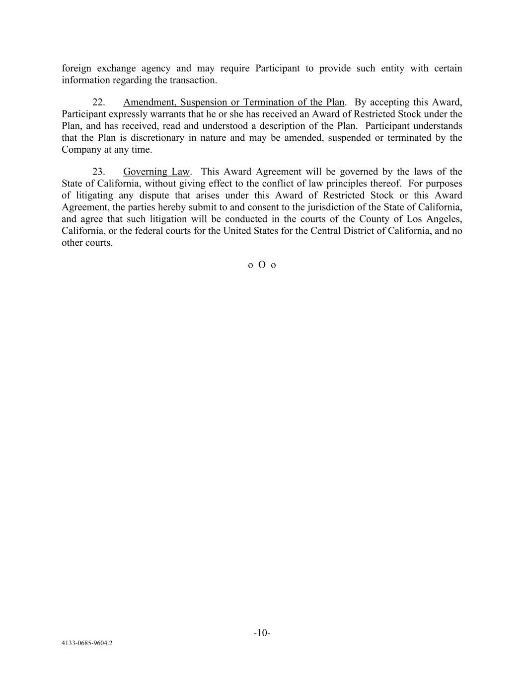 -10- 4133-0685-9604.2 foreign exchange agency and may require Participant to provide such entity with certain information regarding the transaction. 22. Amendment, Suspension or Termination of the Plan. By accepting this Award, Participant expressly warrants that he or she has received an Award of Restricted Stock under the Plan, and has received, read and understood a description of the Plan. Participant understands that the Plan is discretionary in nature and may be amended, suspended or terminated by the Company at any time. 23. Governing Law. This Award Agreement will be governed by the laws of the State of California, without giving effect to the conflict of law principles thereof. For purposes of litigating any dispute that arises under this Award of Restricted Stock or this Award Agreement, the parties hereby submit to and consent to the jurisdiction of the State of California, and agree that such litigation will be conducted in the courts of the County of Los Angeles, California, or the federal courts for the United States for the Central District of California, and no other courts. o O o