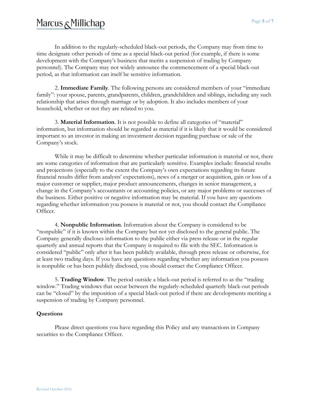 Page 5 of 7 Revised October 2016 In addition to the regularly-scheduled black-out periods, the Company may from time to time designate other periods of time as a special black-out period (for example, if there is some development with the Company’s business that merits a suspension of trading by Company personnel). The Company may not widely announce the commencement of a special black-out period, as that information can itself be sensitive information. 2. Immediate Family. The following persons are considered members of your “immediate family”: your spouse, parents, grandparents, children, grandchildren and siblings, including any such relationship that arises through marriage or by adoption. It also includes members of your household, whether or not they are related to you. 3. Material Information. It is not possible to define all categories of “material” information, but information should be regarded as material if it is likely that it would be considered important to an investor in making an investment decision regarding purchase or sale of the Company’s stock. While it may be difficult to determine whether particular information is material or not, there are some categories of information that are particularly sensitive. Examples include: financial results and projections (especially to the extent the Company’s own expectations regarding its future financial results differ from analysts’ expectations), news of a merger or acquisition, gain or loss of a major customer or supplier, major product announcements, changes in senior management, a change in the Company’s accountants or accounting policies, or any major problems or successes of the business. Either positive or negative information may be material. If you have any questions regarding whether information you possess is material or not, you should contact the Compliance Officer. 4. Nonpublic Information. Information about the Company is considered to be “nonpublic” if it is known within the Company but not yet disclosed to the general public. The Company generally discloses information to the public either via press release or in the regular quarterly and annual reports that the Company is required to file with the SEC. Information is considered “public” only after it has been publicly available, through press release or otherwise, for at least two trading days. If you have any questions regarding whether any information you possess is nonpublic or has been publicly disclosed, you should contact the Compliance Officer. 5. Trading Window. The period outside a black-out period is referred to as the “trading window.” Trading windows that occur between the regularly-scheduled quarterly black-out periods can be “closed” by the imposition of a special black-out period if there are developments meriting a suspension of trading by Company personnel. Questions Please direct questions you have regarding this Policy and any transactions in Company securities to the Compliance Officer.