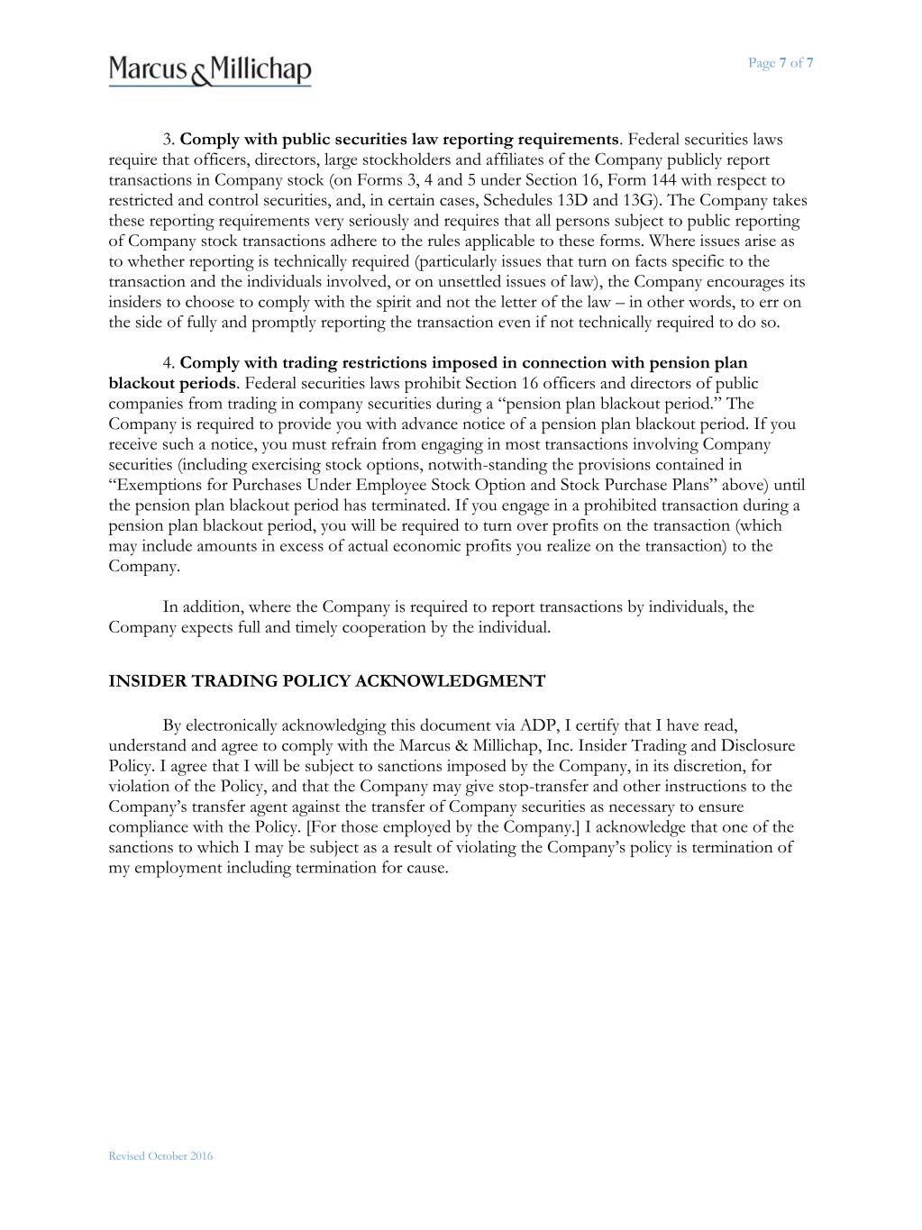 Page 7 of 7 Revised October 2016 3. Comply with public securities law reporting requirements. Federal securities laws require that officers, directors, large stockholders and affiliates of the Company publicly report transactions in Company stock (on Forms 3, 4 and 5 under Section 16, Form 144 with respect to restricted and control securities, and, in certain cases, Schedules 13D and 13G). The Company takes these reporting requirements very seriously and requires that all persons subject to public reporting of Company stock transactions adhere to the rules applicable to these forms. Where issues arise as to whether reporting is technically required (particularly issues that turn on facts specific to the transaction and the individuals involved, or on unsettled issues of law), the Company encourages its insiders to choose to comply with the spirit and not the letter of the law – in other words, to err on the side of fully and promptly reporting the transaction even if not technically required to do so. 4. Comply with trading restrictions imposed in connection with pension plan blackout periods. Federal securities laws prohibit Section 16 officers and directors of public companies from trading in company securities during a “pension plan blackout period.” The Company is required to provide you with advance notice of a pension plan blackout period. If you receive such a notice, you must refrain from engaging in most transactions involving Company securities (including exercising stock options, notwith-standing the provisions contained in “Exemptions for Purchases Under Employee Stock Option and Stock Purchase Plans” above) until the pension plan blackout period has terminated. If you engage in a prohibited transaction during a pension plan blackout period, you will be required to turn over profits on the transaction (which may include amounts in excess of actual economic profits you realize on the transaction) to the Company. In addition, where the Company is required to report transactions by individuals, the Company expects full and timely cooperation by the individual. INSIDER TRADING POLICY ACKNOWLEDGMENT By electronically acknowledging this document via ADP, I certify that I have read, understand and agree to comply with the Marcus & Millichap, Inc. Insider Trading and Disclosure Policy. I agree that I will be subject to sanctions imposed by the Company, in its discretion, for violation of the Policy, and that the Company may give stop-transfer and other instructions to the Company’s transfer agent against the transfer of Company securities as necessary to ensure compliance with the Policy. [For those employed by the Company.] I acknowledge that one of the sanctions to which I may be subject as a result of violating the Company’s policy is termination of my employment including termination for cause.