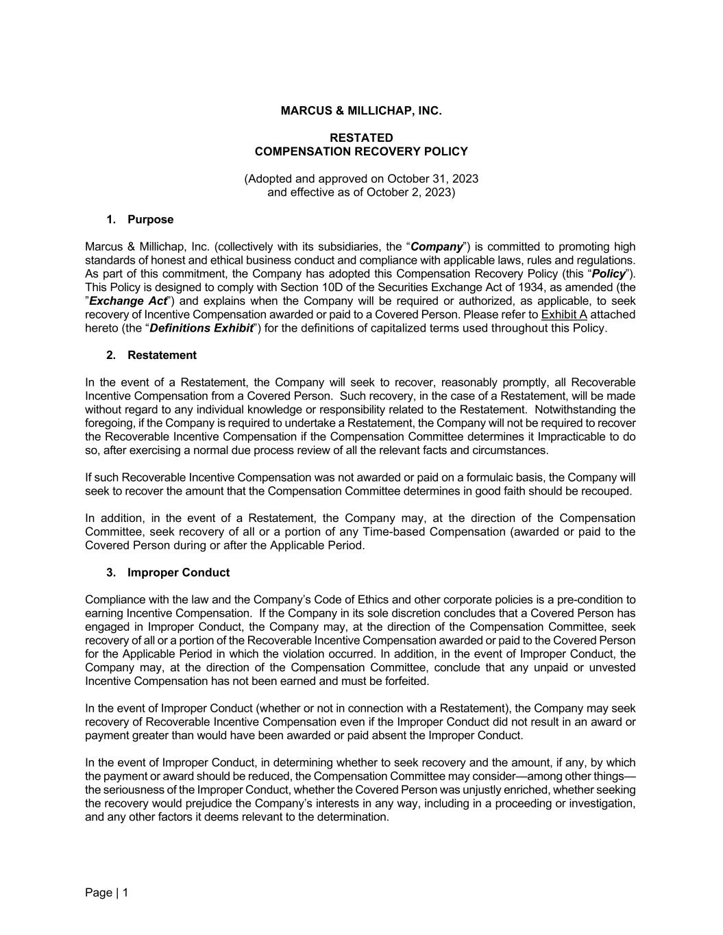 Page | 1 MARCUS & MILLICHAP, INC. RESTATED COMPENSATION RECOVERY POLICY (Adopted and approved on October 31, 2023 and effective as of October 2, 2023) 1. Purpose Marcus & Millichap, Inc. (collectively with its subsidiaries, the “Company”) is committed to promoting high standards of honest and ethical business conduct and compliance with applicable laws, rules and regulations. As part of this commitment, the Company has adopted this Compensation Recovery Policy (this “Policy”). This Policy is designed to comply with Section 10D of the Securities Exchange Act of 1934, as amended (the ”Exchange Act”) and explains when the Company will be required or authorized, as applicable, to seek recovery of Incentive Compensation awarded or paid to a Covered Person. Please refer to Exhibit A attached hereto (the “Definitions Exhibit”) for the definitions of capitalized terms used throughout this Policy. 2. Restatement In the event of a Restatement, the Company will seek to recover, reasonably promptly, all Recoverable Incentive Compensation from a Covered Person. Such recovery, in the case of a Restatement, will be made without regard to any individual knowledge or responsibility related to the Restatement. Notwithstanding the foregoing, if the Company is required to undertake a Restatement, the Company will not be required to recover the Recoverable Incentive Compensation if the Compensation Committee determines it Impracticable to do so, after exercising a normal due process review of all the relevant facts and circumstances. If such Recoverable Incentive Compensation was not awarded or paid on a formulaic basis, the Company will seek to recover the amount that the Compensation Committee determines in good faith should be recouped. In addition, in the event of a Restatement, the Company may, at the direction of the Compensation Committee, seek recovery of all or a portion of any Time-based Compensation (awarded or paid to the Covered Person during or after the Applicable Period. 3. Improper Conduct Compliance with the law and the Company’s Code of Ethics and other corporate policies is a pre-condition to earning Incentive Compensation. If the Company in its sole discretion concludes that a Covered Person has engaged in Improper Conduct, the Company may, at the direction of the Compensation Committee, seek recovery of all or a portion of the Recoverable Incentive Compensation awarded or paid to the Covered Person for the Applicable Period in which the violation occurred. In addition, in the event of Improper Conduct, the Company may, at the direction of the Compensation Committee, conclude that any unpaid or unvested Incentive Compensation has not been earned and must be forfeited. In the event of Improper Conduct (whether or not in connection with a Restatement), the Company may seek recovery of Recoverable Incentive Compensation even if the Improper Conduct did not result in an award or payment greater than would have been awarded or paid absent the Improper Conduct. In the event of Improper Conduct, in determining whether to seek recovery and the amount, if any, by which the payment or award should be reduced, the Compensation Committee may consider—among other things— the seriousness of the Improper Conduct, whether the Covered Person was unjustly enriched, whether seeking the recovery would prejudice the Company’s interests in any way, including in a proceeding or investigation, and any other factors it deems relevant to the determination.