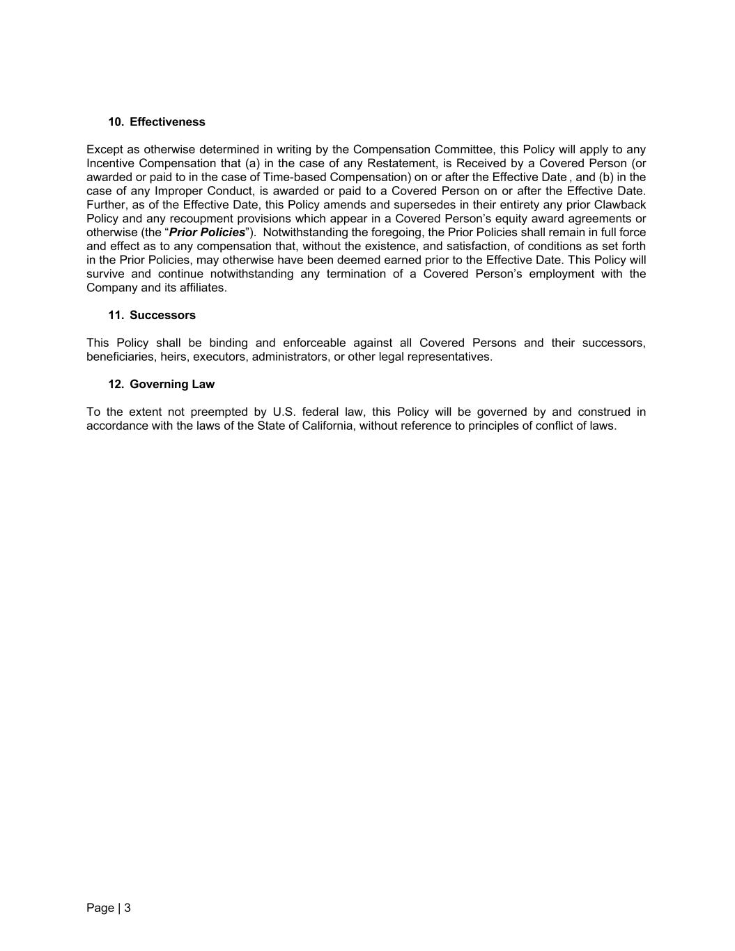 Page | 3 10. Effectiveness Except as otherwise determined in writing by the Compensation Committee, this Policy will apply to any Incentive Compensation that (a) in the case of any Restatement, is Received by a Covered Person (or awarded or paid to in the case of Time-based Compensation) on or after the Effective Date , and (b) in the case of any Improper Conduct, is awarded or paid to a Covered Person on or after the Effective Date. Further, as of the Effective Date, this Policy amends and supersedes in their entirety any prior Clawback Policy and any recoupment provisions which appear in a Covered Person’s equity award agreements or otherwise (the “Prior Policies”). Notwithstanding the foregoing, the Prior Policies shall remain in full force and effect as to any compensation that, without the existence, and satisfaction, of conditions as set forth in the Prior Policies, may otherwise have been deemed earned prior to the Effective Date. This Policy will survive and continue notwithstanding any termination of a Covered Person’s employment with the Company and its affiliates. 11. Successors This Policy shall be binding and enforceable against all Covered Persons and their successors, beneficiaries, heirs, executors, administrators, or other legal representatives. 12. Governing Law To the extent not preempted by U.S. federal law, this Policy will be governed by and construed in accordance with the laws of the State of California, without reference to principles of conflict of laws.