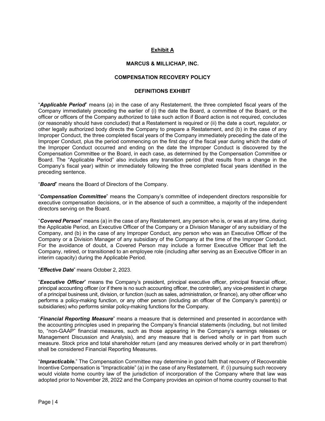 Page | 4 Exhibit A MARCUS & MILLICHAP, INC. COMPENSATION RECOVERY POLICY DEFINITIONS EXHIBIT “Applicable Period” means (a) in the case of any Restatement, the three completed fiscal years of the Company immediately preceding the earlier of (i) the date the Board, a committee of the Board, or the officer or officers of the Company authorized to take such action if Board action is not required, concludes (or reasonably should have concluded) that a Restatement is required or (ii) the date a court, regulator, or other legally authorized body directs the Company to prepare a Restatement, and (b) in the case of any Improper Conduct, the three completed fiscal years of the Company immediately preceding the date of the Improper Conduct, plus the period commencing on the first day of the fiscal year during which the date of the Improper Conduct occurred and ending on the date the Improper Conduct is discovered by the Compensation Committee or the Board, in each case, as determined by the Compensation Committee or Board. The “Applicable Period” also includes any transition period (that results from a change in the Company’s fiscal year) within or immediately following the three completed fiscal years identified in the preceding sentence. “Board” means the Board of Directors of the Company. “Compensation Committee” means the Company’s committee of independent directors responsible for executive compensation decisions, or in the absence of such a committee, a majority of the independent directors serving on the Board. “Covered Person” means (a) in the case of any Restatement, any person who is, or was at any time, during the Applicable Period, an Executive Officer of the Company or a Division Manager of any subsidiary of the Company, and (b) in the case of any Improper Conduct, any person who was an Executive Officer of the Company or a Division Manager of any subsidiary of the Company at the time of the Improper Conduct. For the avoidance of doubt, a Covered Person may include a former Executive Officer that left the Company, retired, or transitioned to an employee role (including after serving as an Executive Officer in an interim capacity) during the Applicable Period. "Effective Date” means October 2, 2023. “Executive Officer” means the Company’s president, principal executive officer, principal financial officer, principal accounting officer (or if there is no such accounting officer, the controller), any vice-president in charge of a principal business unit, division, or function (such as sales, administration, or finance), any other officer who performs a policy-making function, or any other person (including an officer of the Company’s parent(s) or subsidiaries) who performs similar policy-making functions for the Company. “Financial Reporting Measure” means a measure that is determined and presented in accordance with the accounting principles used in preparing the Company’s financial statements (including, but not limited to, “non-GAAP” financial measures, such as those appearing in the Company’s earnings releases or Management Discussion and Analysis), and any measure that is derived wholly or in part from such measure. Stock price and total shareholder return (and any measures derived wholly or in part therefrom) shall be considered Financial Reporting Measures. “Impracticable.” The Compensation Committee may determine in good faith that recovery of Recoverable Incentive Compensation is “Impracticable” (a) in the case of any Restatement, if: (i) pursuing such recovery would violate home country law of the jurisdiction of incorporation of the Company where that law was adopted prior to November 28, 2022 and the Company provides an opinion of home country counsel to that
