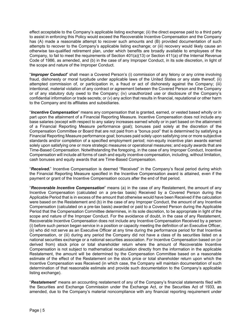 Page | 5 effect acceptable to the Company’s applicable listing exchange; (ii) the direct expense paid to a third party to assist in enforcing this Policy would exceed the Recoverable Incentive Compensation and the Company has (A) made a reasonable attempt to recover such amounts and (B) provided documentation of such attempts to recover to the Company’s applicable listing exchange; or (iii) recovery would likely cause an otherwise tax-qualified retirement plan, under which benefits are broadly available to employees of the Company, to fail to meet the requirements of Section 401(a)(13) or Section 411(a) of the Internal Revenue Code of 1986, as amended, and (b) in the case of any Improper Conduct, in its sole discretion, in light of the scope and nature of the Improper Conduct. “Improper Conduct” shall mean a Covered Person’s (i) commission of any felony or any crime involving fraud, dishonesty or moral turpitude under applicable laws of the United States or any state thereof; (ii) attempted commission of, or participation in, a fraud or act of dishonesty against the Company; (iii) intentional, material violation of any contract or agreement between the Covered Person and the Company or of any statutory duty owed to the Company; (iv) unauthorized use or disclosure of the Company’s confidential information or trade secrets; or (v) any action that results in financial, reputational or other harm to the Company and its affiliates and subsidiaries. “Incentive Compensation” means any compensation that is granted, earned, or vested based wholly or in part upon the attainment of a Financial Reporting Measure. Incentive Compensation does not include any base salaries (except with respect to any salary increases earned wholly or in part based on the attainment of a Financial Reporting Measure performance goal); bonuses paid solely at the discretion of the Compensation Committee or Board that are not paid from a “bonus pool” that is determined by satisfying a Financial Reporting Measure performance goal; bonuses paid solely upon satisfying one or more subjective standards and/or completion of a specified employment period; non-equity incentive plan awards earned solely upon satisfying one or more strategic measures or operational measures; and equity awards that are Time-Based Compensation. Notwithstanding the foregoing, in the case of any Improper Conduct, Incentive Compensation will include all forms of cash and equity incentive compensation, including, without limitation, cash bonuses and equity awards that are Time-Based Compensation. “Received.” Incentive Compensation is deemed “Received” in the Company’s fiscal period during which the Financial Reporting Measure specified in the Incentive Compensation award is attained, even if the payment or grant of the Incentive Compensation occurs after the end of that period. “Recoverable Incentive Compensation” means (a) in the case of any Restatement, the amount of any Incentive Compensation (calculated on a pre-tax basis) Received by a Covered Person during the Applicable Period that is in excess of the amount that otherwise would have been Received if the calculation were based on the Restatement and (b) in the case of any Improper Conduct, the amount of any Incentive Compensation (calculated on a pre-tax basis) awarded or paid to a Covered Person during the Applicable Period that the Compensation Committee determines, in its sole discretion, to be appropriate in light of the scope and nature of the Improper Conduct. For the avoidance of doubt, in the case of any Restatement, Recoverable Incentive Compensation does not include any Incentive Compensation Received by a person (i) before such person began service in a position or capacity meeting the definition of an Executive Officer, (ii) who did not serve as an Executive Officer at any time during the performance period for that Incentive Compensation, or (iii) during any period the Company did not have a class of its securities listed on a national securities exchange or a national securities association. For Incentive Compensation based on (or derived from) stock price or total shareholder return where the amount of Recoverable Incentive Compensation is not subject to mathematical recalculation directly from the information in the applicable Restatement, the amount will be determined by the Compensation Committee based on a reasonable estimate of the effect of the Restatement on the stock price or total shareholder return upon which the Incentive Compensation was Received (in which case, the Company will maintain documentation of such determination of that reasonable estimate and provide such documentation to the Company’s applicable listing exchange). “Restatement” means an accounting restatement of any of the Company’s financial statements filed with the Securities and Exchange Commission under the Exchange Act, or the Securities Act of 1933, as amended, due to the Company’s material noncompliance with any financial reporting requirement under