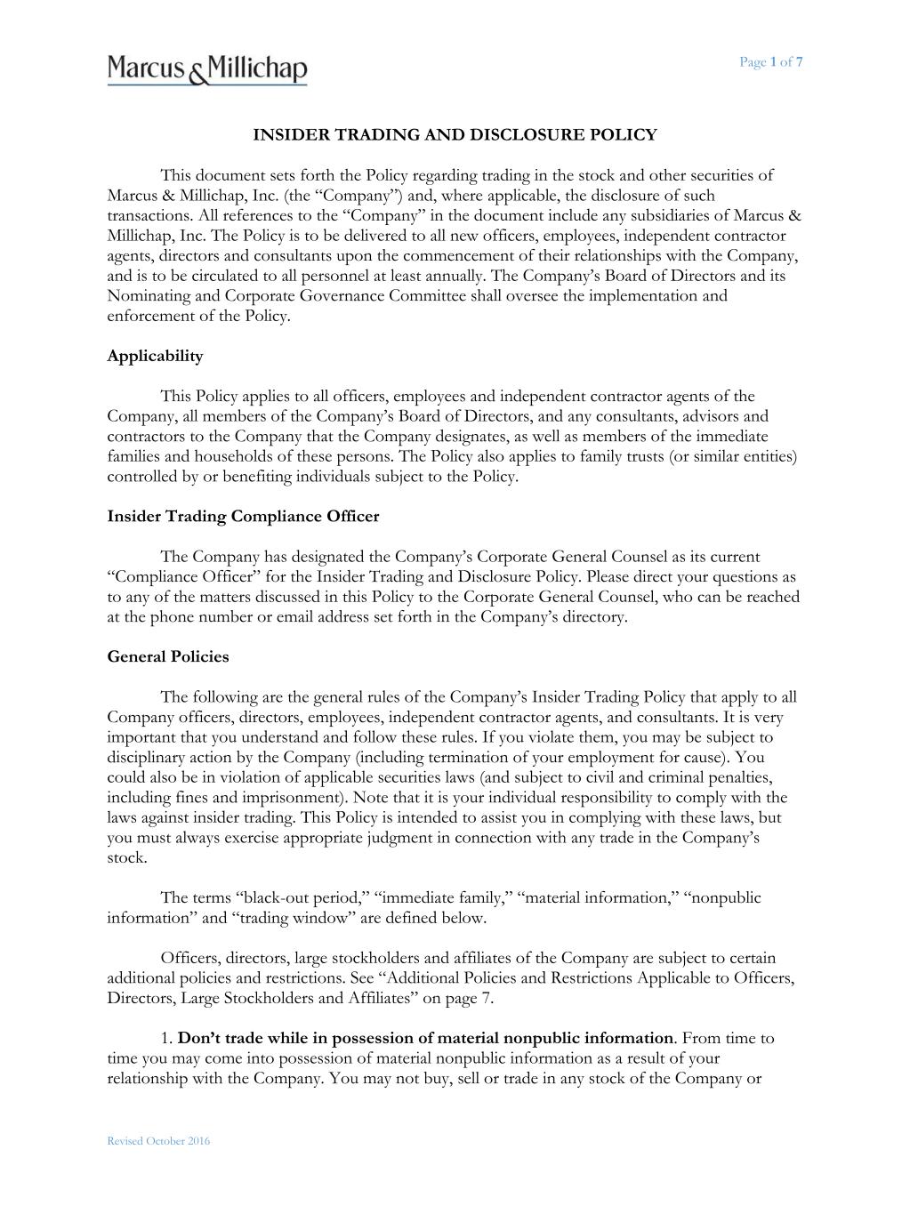 Page 1 of 7 Revised October 2016 INSIDER TRADING AND DISCLOSURE POLICY This document sets forth the Policy regarding trading in the stock and other securities of Marcus & Millichap, Inc. (the “Company”) and, where applicable, the disclosure of such transactions. All references to the “Company” in the document include any subsidiaries of Marcus & Millichap, Inc. The Policy is to be delivered to all new officers, employees, independent contractor agents, directors and consultants upon the commencement of their relationships with the Company, and is to be circulated to all personnel at least annually. The Company’s Board of Directors and its Nominating and Corporate Governance Committee shall oversee the implementation and enforcement of the Policy. Applicability This Policy applies to all officers, employees and independent contractor agents of the Company, all members of the Company’s Board of Directors, and any consultants, advisors and contractors to the Company that the Company designates, as well as members of the immediate families and households of these persons. The Policy also applies to family trusts (or similar entities) controlled by or benefiting individuals subject to the Policy. Insider Trading Compliance Officer The Company has designated the Company’s Corporate General Counsel as its current “Compliance Officer” for the Insider Trading and Disclosure Policy. Please direct your questions as to any of the matters discussed in this Policy to the Corporate General Counsel, who can be reached at the phone number or email address set forth in the Company’s directory. General Policies The following are the general rules of the Company’s Insider Trading Policy that apply to all Company officers, directors, employees, independent contractor agents, and consultants. It is very important that you understand and follow these rules. If you violate them, you may be subject to disciplinary action by the Company (including termination of your employment for cause). You could also be in violation of applicable securities laws (and subject to civil and criminal penalties, including fines and imprisonment). Note that it is your individual responsibility to comply with the laws against insider trading. This Policy is intended to assist you in complying with these laws, but you must always exercise appropriate judgment in connection with any trade in the Company’s stock. The terms “black-out period,” “immediate family,” “material information,” “nonpublic information” and “trading window” are defined below. Officers, directors, large stockholders and affiliates of the Company are subject to certain additional policies and restrictions. See “Additional Policies and Restrictions Applicable to Officers, Directors, Large Stockholders and Affiliates” on page 7. 1. Don’t trade while in possession of material nonpublic information. From time to time you may come into possession of material nonpublic information as a result of your relationship with the Company. You may not buy, sell or trade in any stock of the Company or
