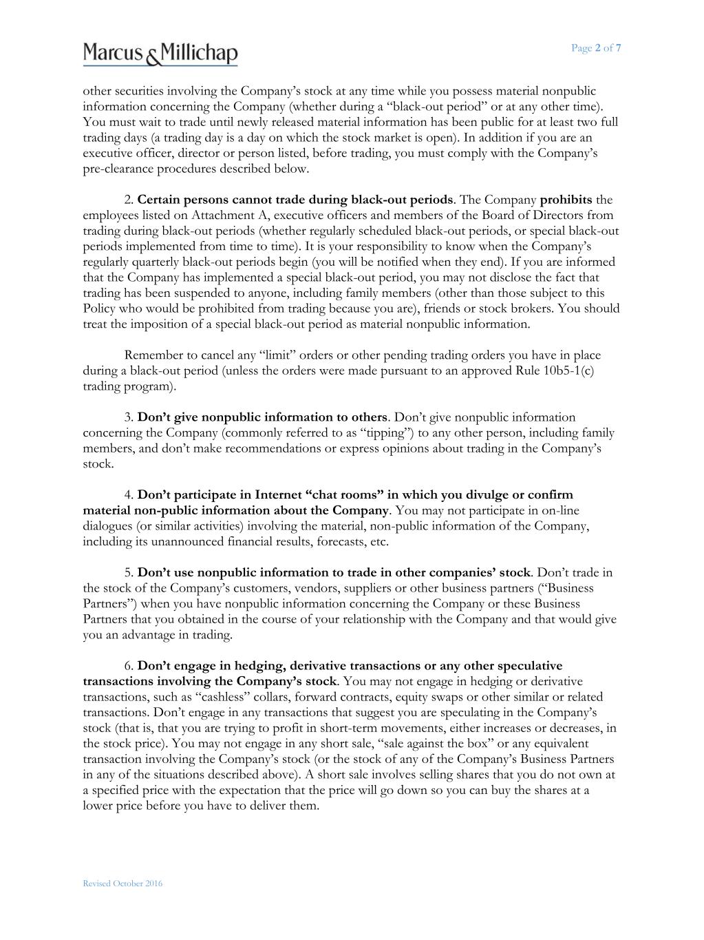Page 2 of 7 Revised October 2016 other securities involving the Company’s stock at any time while you possess material nonpublic information concerning the Company (whether during a “black-out period” or at any other time). You must wait to trade until newly released material information has been public for at least two full trading days (a trading day is a day on which the stock market is open). In addition if you are an executive officer, director or person listed, before trading, you must comply with the Company’s pre-clearance procedures described below. 2. Certain persons cannot trade during black-out periods. The Company prohibits the employees listed on Attachment A, executive officers and members of the Board of Directors from trading during black-out periods (whether regularly scheduled black-out periods, or special black-out periods implemented from time to time). It is your responsibility to know when the Company’s regularly quarterly black-out periods begin (you will be notified when they end). If you are informed that the Company has implemented a special black-out period, you may not disclose the fact that trading has been suspended to anyone, including family members (other than those subject to this Policy who would be prohibited from trading because you are), friends or stock brokers. You should treat the imposition of a special black-out period as material nonpublic information. Remember to cancel any “limit” orders or other pending trading orders you have in place during a black-out period (unless the orders were made pursuant to an approved Rule 10b5-1(c) trading program). 3. Don’t give nonpublic information to others. Don’t give nonpublic information concerning the Company (commonly referred to as “tipping”) to any other person, including family members, and don’t make recommendations or express opinions about trading in the Company’s stock. 4. Don’t participate in Internet “chat rooms” in which you divulge or confirm material non-public information about the Company. You may not participate in on-line dialogues (or similar activities) involving the material, non-public information of the Company, including its unannounced financial results, forecasts, etc. 5. Don’t use nonpublic information to trade in other companies’ stock. Don’t trade in the stock of the Company’s customers, vendors, suppliers or other business partners (“Business Partners”) when you have nonpublic information concerning the Company or these Business Partners that you obtained in the course of your relationship with the Company and that would give you an advantage in trading. 6. Don’t engage in hedging, derivative transactions or any other speculative transactions involving the Company’s stock. You may not engage in hedging or derivative transactions, such as “cashless” collars, forward contracts, equity swaps or other similar or related transactions. Don’t engage in any transactions that suggest you are speculating in the Company’s stock (that is, that you are trying to profit in short-term movements, either increases or decreases, in the stock price). You may not engage in any short sale, “sale against the box” or any equivalent transaction involving the Company’s stock (or the stock of any of the Company’s Business Partners in any of the situations described above). A short sale involves selling shares that you do not own at a specified price with the expectation that the price will go down so you can buy the shares at a lower price before you have to deliver them.