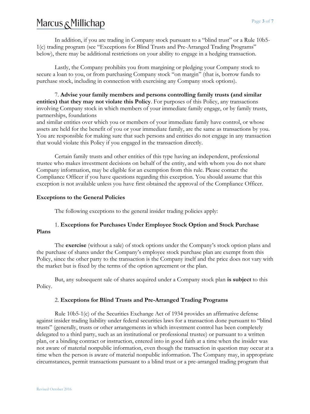 Page 3 of 7 Revised October 2016 In addition, if you are trading in Company stock pursuant to a “blind trust” or a Rule 10b5- 1(c) trading program (see “Exceptions for Blind Trusts and Pre-Arranged Trading Programs” below), there may be additional restrictions on your ability to engage in a hedging transaction. Lastly, the Company prohibits you from margining or pledging your Company stock to secure a loan to you, or from purchasing Company stock “on margin” (that is, borrow funds to purchase stock, including in connection with exercising any Company stock options). 7. Advise your family members and persons controlling family trusts (and similar entities) that they may not violate this Policy. For purposes of this Policy, any transactions involving Company stock in which members of your immediate family engage, or by family trusts, partnerships, foundations and similar entities over which you or members of your immediate family have control, or whose assets are held for the benefit of you or your immediate family, are the same as transactions by you. You are responsible for making sure that such persons and entities do not engage in any transaction that would violate this Policy if you engaged in the transaction directly. Certain family trusts and other entities of this type having an independent, professional trustee who makes investment decisions on behalf of the entity, and with whom you do not share Company information, may be eligible for an exemption from this rule. Please contact the Compliance Officer if you have questions regarding this exception. You should assume that this exception is not available unless you have first obtained the approval of the Compliance Officer. Exceptions to the General Policies The following exceptions to the general insider trading policies apply: 1. Exceptions for Purchases Under Employee Stock Option and Stock Purchase Plans The exercise (without a sale) of stock options under the Company’s stock option plans and the purchase of shares under the Company’s employee stock purchase plan are exempt from this Policy, since the other party to the transaction is the Company itself and the price does not vary with the market but is fixed by the terms of the option agreement or the plan. But, any subsequent sale of shares acquired under a Company stock plan is subject to this Policy. 2. Exceptions for Blind Trusts and Pre-Arranged Trading Programs Rule 10b5-1(c) of the Securities Exchange Act of 1934 provides an affirmative defense against insider trading liability under federal securities laws for a transaction done pursuant to “blind trusts” (generally, trusts or other arrangements in which investment control has been completely delegated to a third party, such as an institutional or professional trustee) or pursuant to a written plan, or a binding contract or instruction, entered into in good faith at a time when the insider was not aware of material nonpublic information, even though the transaction in question may occur at a time when the person is aware of material nonpublic information. The Company may, in appropriate circumstances, permit transactions pursuant to a blind trust or a pre-arranged trading program that