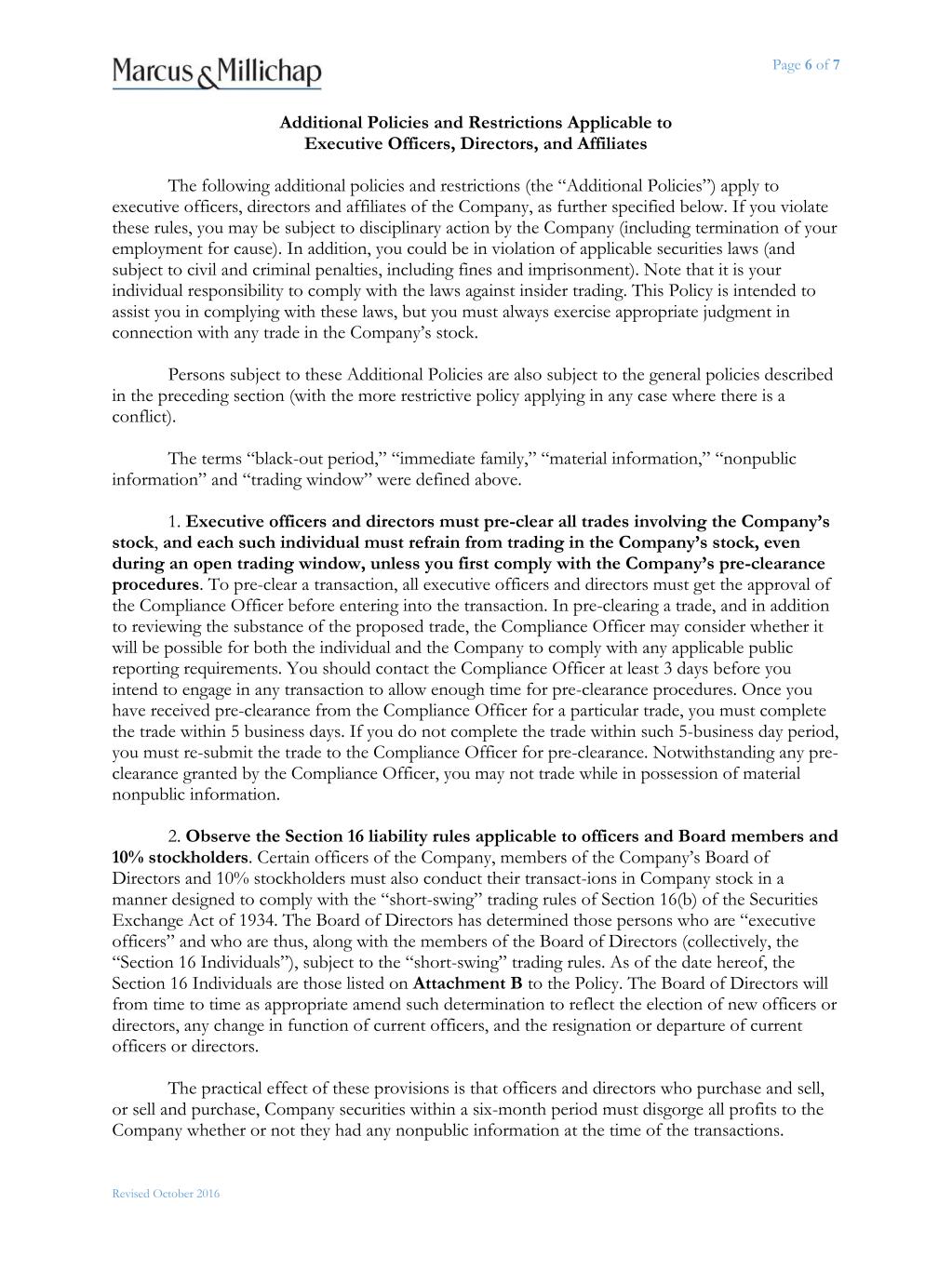 Page 6 of 7 Revised October 2016 Additional Policies and Restrictions Applicable to Executive Officers, Directors, and Affiliates The following additional policies and restrictions (the “Additional Policies”) apply to executive officers, directors and affiliates of the Company, as further specified below. If you violate these rules, you may be subject to disciplinary action by the Company (including termination of your employment for cause). In addition, you could be in violation of applicable securities laws (and subject to civil and criminal penalties, including fines and imprisonment). Note that it is your individual responsibility to comply with the laws against insider trading. This Policy is intended to assist you in complying with these laws, but you must always exercise appropriate judgment in connection with any trade in the Company’s stock. Persons subject to these Additional Policies are also subject to the general policies described in the preceding section (with the more restrictive policy applying in any case where there is a conflict). The terms “black-out period,” “immediate family,” “material information,” “nonpublic information” and “trading window” were defined above. 1. Executive officers and directors must pre-clear all trades involving the Company’s stock, and each such individual must refrain from trading in the Company’s stock, even during an open trading window, unless you first comply with the Company’s pre-clearance procedures. To pre-clear a transaction, all executive officers and directors must get the approval of the Compliance Officer before entering into the transaction. In pre-clearing a trade, and in addition to reviewing the substance of the proposed trade, the Compliance Officer may consider whether it will be possible for both the individual and the Company to comply with any applicable public reporting requirements. You should contact the Compliance Officer at least 3 days before you intend to engage in any transaction to allow enough time for pre-clearance procedures. Once you have received pre-clearance from the Compliance Officer for a particular trade, you must complete the trade within 5 business days. If you do not complete the trade within such 5-business day period, you must re-submit the trade to the Compliance Officer for pre-clearance. Notwithstanding any pre- clearance granted by the Compliance Officer, you may not trade while in possession of material nonpublic information. 2. Observe the Section 16 liability rules applicable to officers and Board members and 10% stockholders. Certain officers of the Company, members of the Company’s Board of Directors and 10% stockholders must also conduct their transact-ions in Company stock in a manner designed to comply with the “short-swing” trading rules of Section 16(b) of the Securities Exchange Act of 1934. The Board of Directors has determined those persons who are “executive officers” and who are thus, along with the members of the Board of Directors (collectively, the “Section 16 Individuals”), subject to the “short-swing” trading rules. As of the date hereof, the Section 16 Individuals are those listed on Attachment B to the Policy. The Board of Directors will from time to time as appropriate amend such determination to reflect the election of new officers or directors, any change in function of current officers, and the resignation or departure of current officers or directors. The practical effect of these provisions is that officers and directors who purchase and sell, or sell and purchase, Company securities within a six-month period must disgorge all profits to the Company whether or not they had any nonpublic information at the time of the transactions.